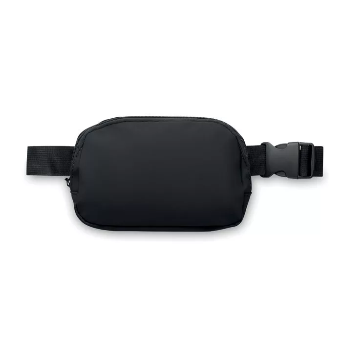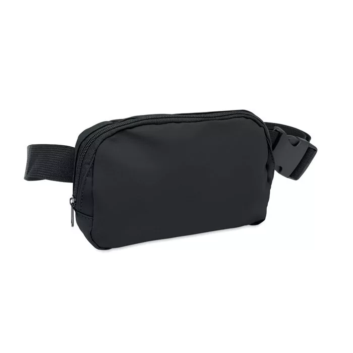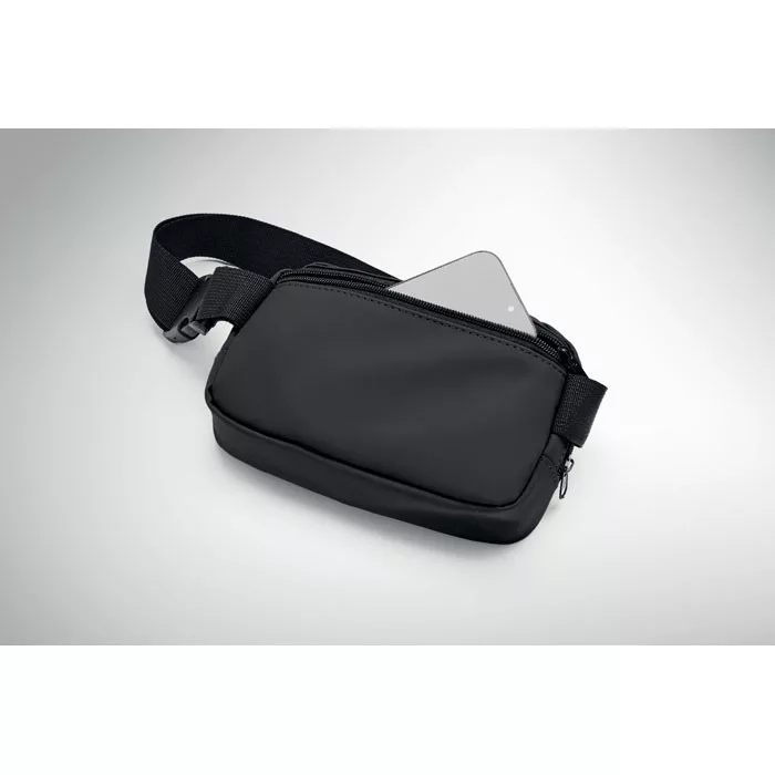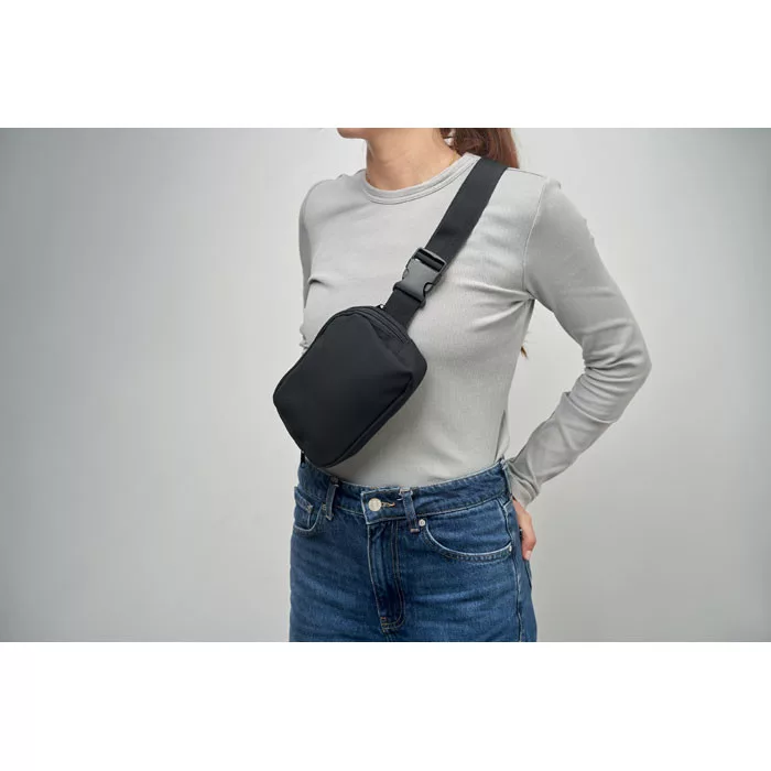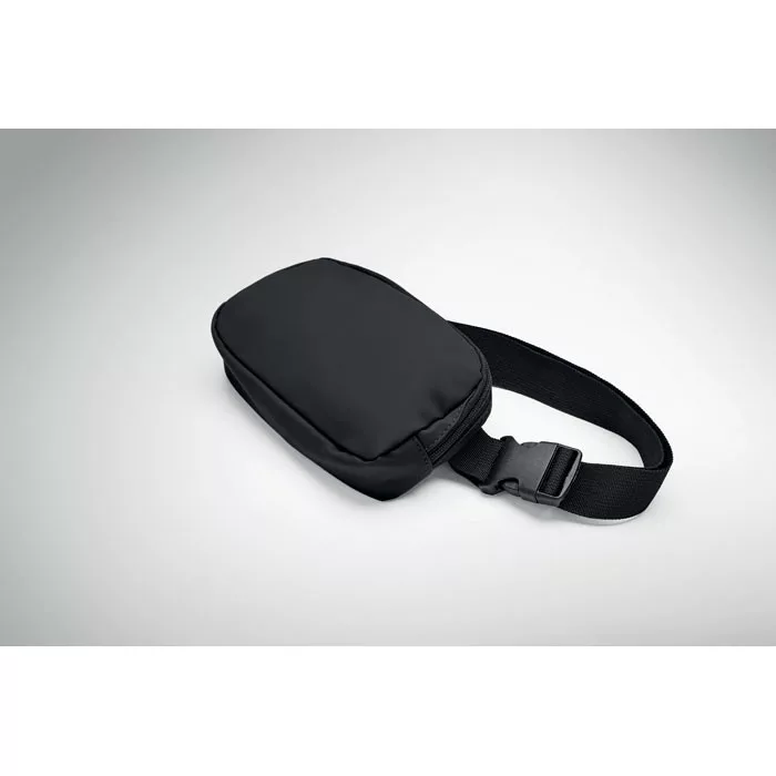 Övtáska vagy keresztpántos táska puha PU anyagból, 210D RPET poliészter béléssel. 1 cipzáras fő rekesz, 1 cipzáras hátsó zseb és hálós belső rekesz.