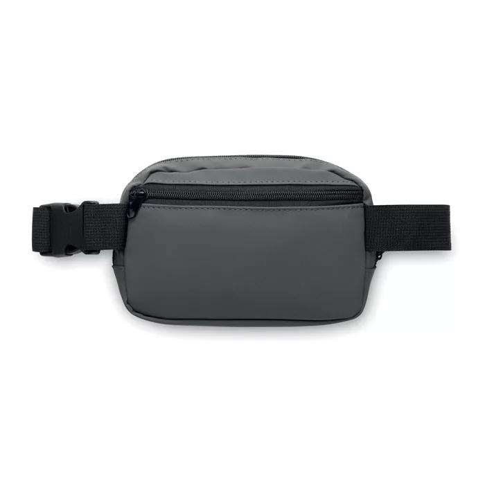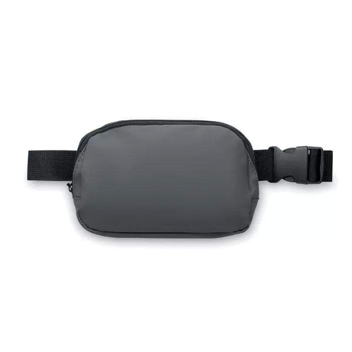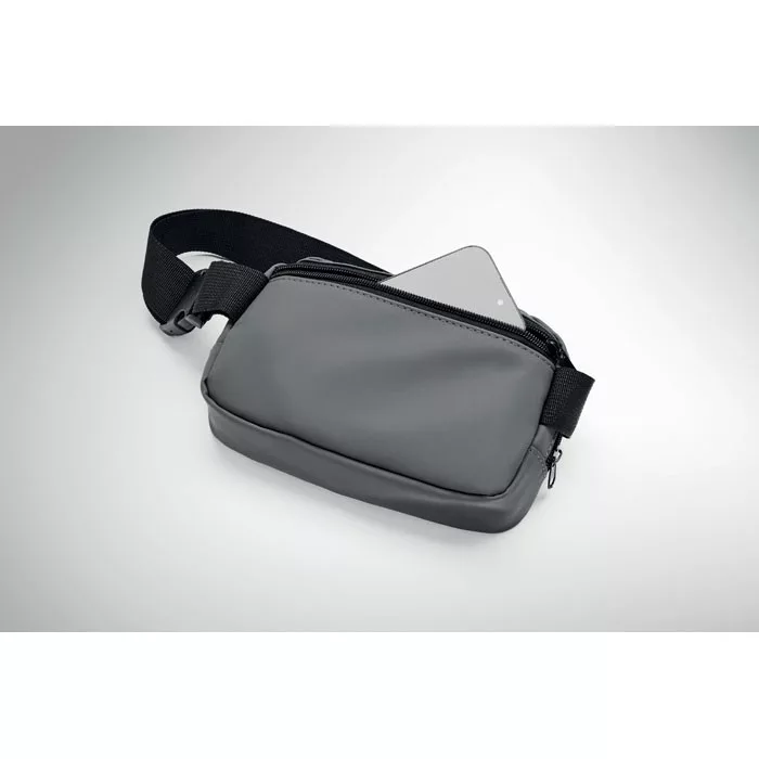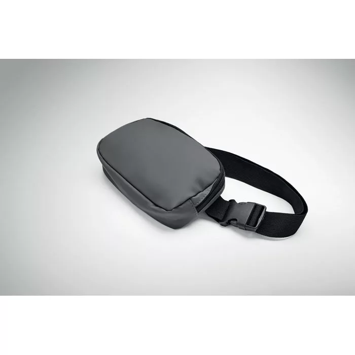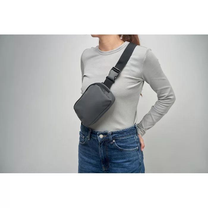 Övtáska vagy keresztpántos táska puha PU anyagból, 210D RPET poliészter béléssel. 1 cipzáras fő rekesz, 1 cipzáras hátsó zseb és hálós belső rekesz.