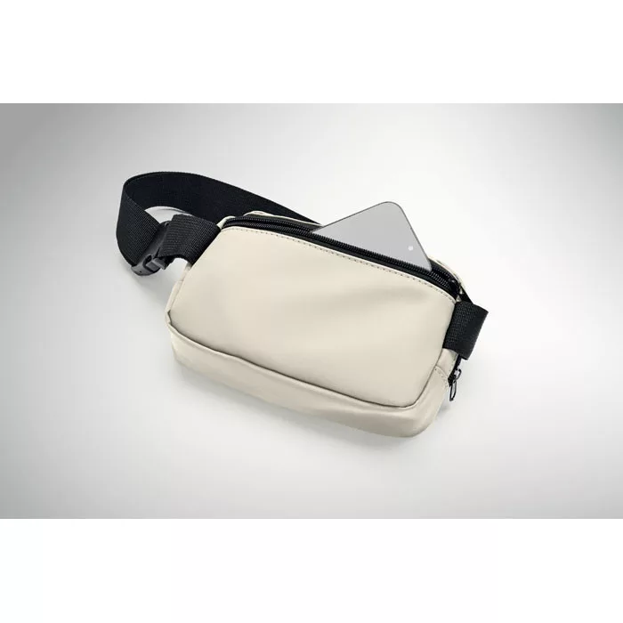 Övtáska vagy keresztpántos táska puha PU anyagból, 210D RPET poliészter béléssel. 1 cipzáras fő rekesz, 1 cipzáras hátsó zseb és hálós belső rekesz.