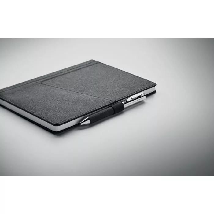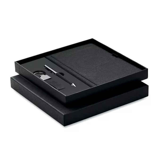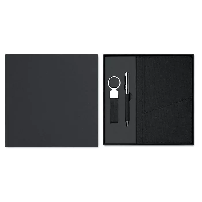 3 darabos ajándékkészlet díszdobozban. Tartalmaz egy csavarzáras fém golyóstollat RPET poliészter részletekkel, RPET keményfedeles jegyzetfüzetet okostelefon tartó zsebbel az elülső oldalán és RPET poliészter kulcstartót. Kéken író betéttel. FSC MIX CREDIT | P7.1 | FSC- C213206