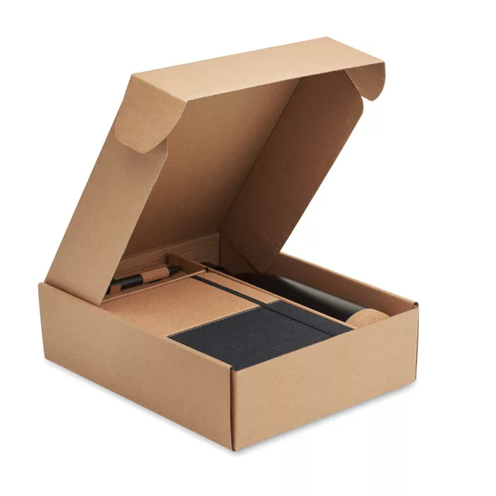 3 darabos ajándékkészlet. Tartalma: egy 500 ml-es, duplafalú, rozsdamentes acél termoszpalack, egy A5-ös cérnafűzött jegyzetfüzet RPET és parafa keménytáblás borítóval, 160 vonalas oldallal (80 lappal) újrahasznosított papírból és egy kéken író alumínium golyóstoll. FSC®-certified | FSC MIX CREDIT, P7.1, N3.7, FSC-C213206