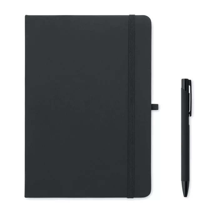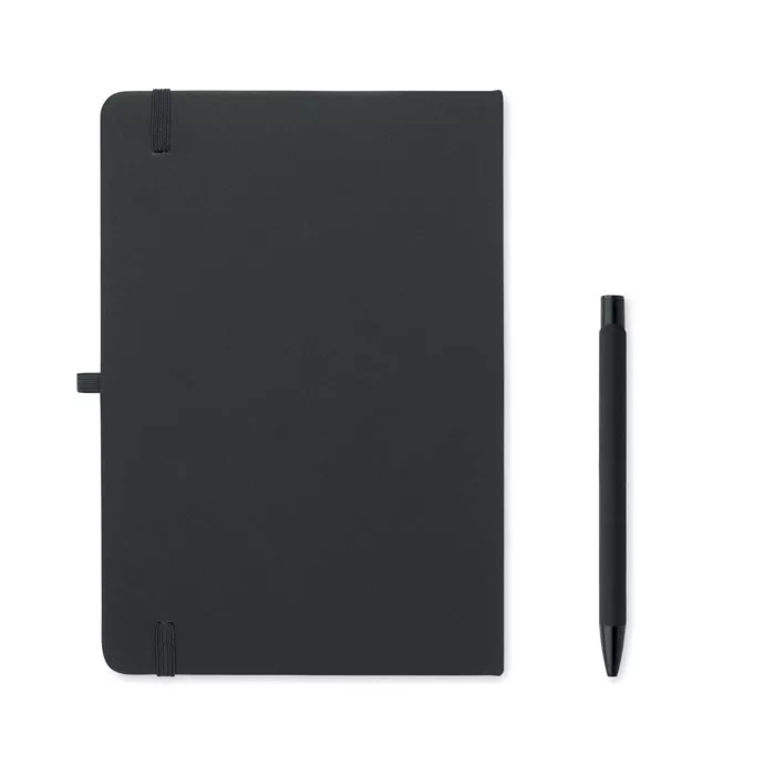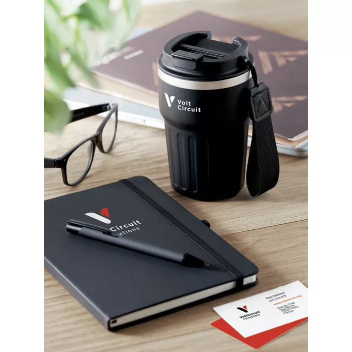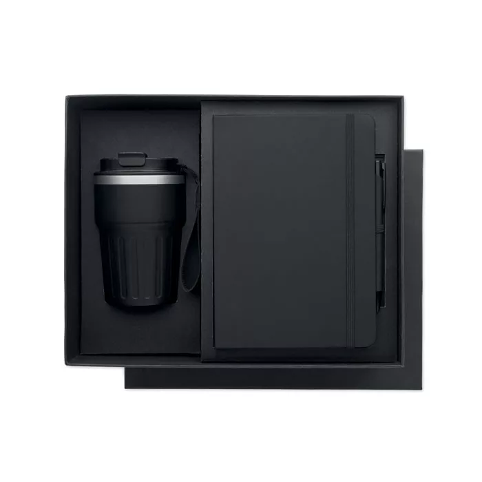 A5 jegyzetfüzet, újrahasznosított alumínium golyóstoll és 350 ml-es duplafalú, újrahasznosított rozsdamentes acél pohár PP, ivónyílásos fedéllel, pánttal, díszdobozban.