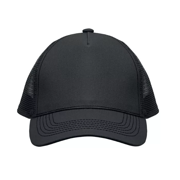 5 paneles kamionos sapka 250 g/m² pamut elülső panellel és ellenzővel, poliészter hálós hátoldallal, tépőzáras záródással.