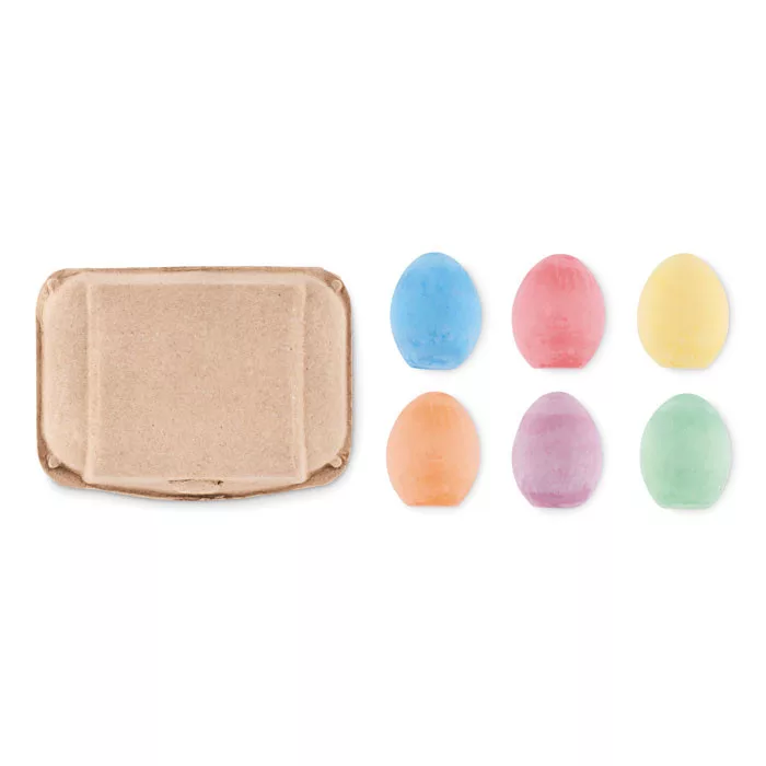 6 darabos tojás alakú aszfaltkréta készlet karton tojástartóban. Ne tévessze össze őket a húsvéti festett tojásokkal! Lehet, hogy megtévesztően valódinak tűnnek, de gyönyörű rajzok és művészeti alkotások készítéséhez kell használni őket. Nagyszerű ajándék kreatív gyerekeknek húsvétkor vagy bármikor az év folyamán.