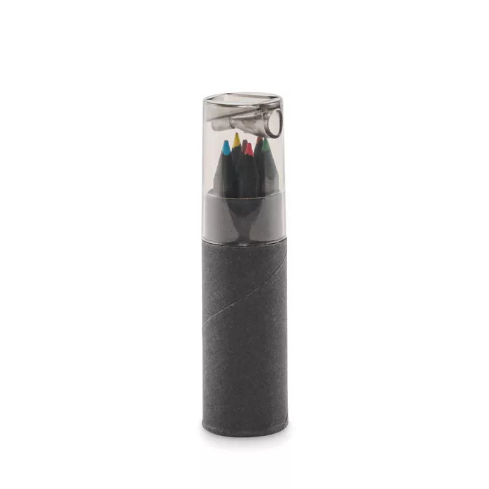 6 darab színes ceruza, fekete hengeres karton tokban. A doboz áttetsző fedele ceruzahegyezőt tartalmaz.