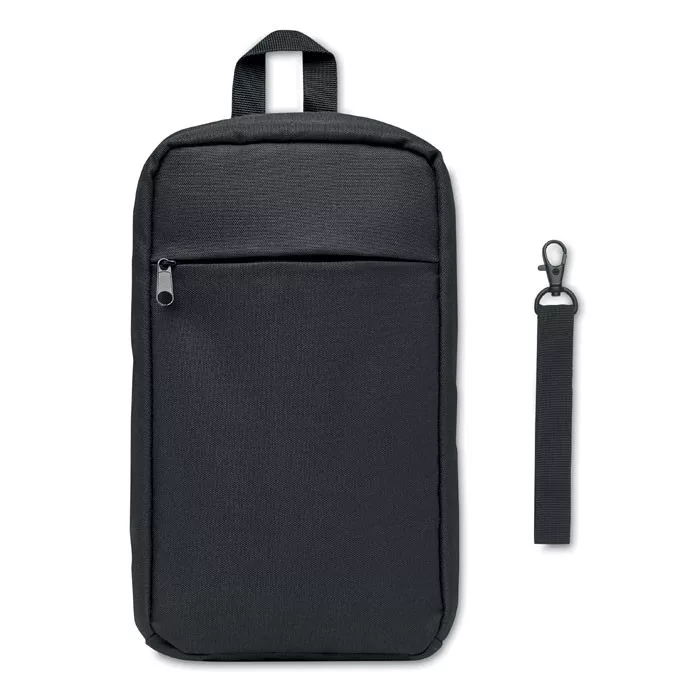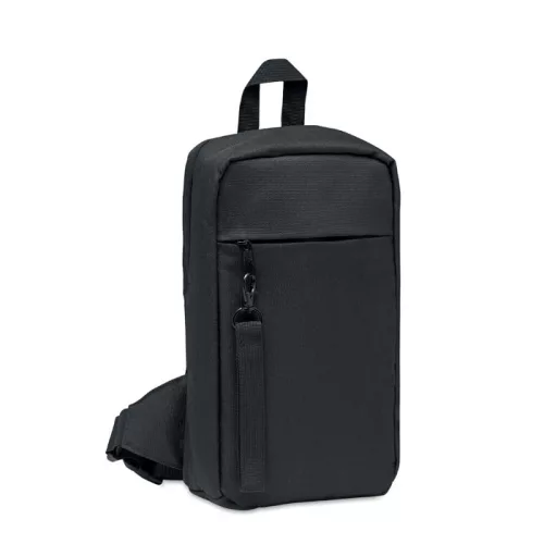 Keresztpántos testtáska 600D RPET poliészterből. Párnázott fő rekesz RPET hálós zsebbel és cipzáras elülső zsebbel. Állítható pánt és külön fogantyú.
