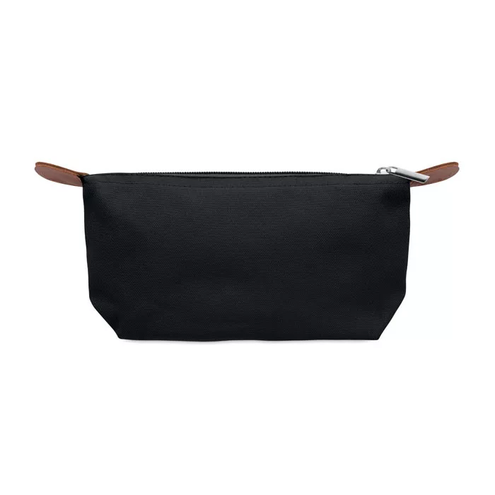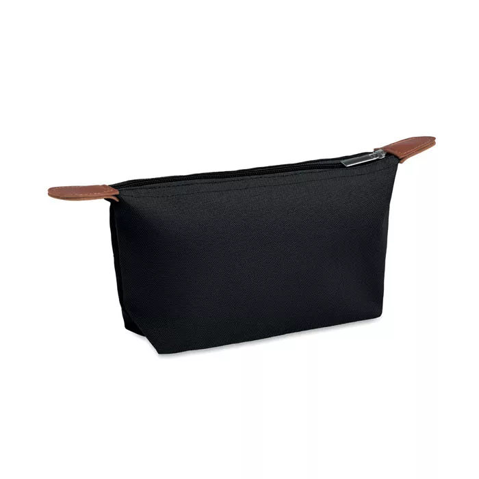 Kozmetikai táska 600D RPET poliészterből, felső cipzáras záródással és barna PU részletekkel.