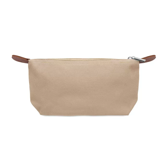 Kozmetikai táska 600D RPET poliészterből, felső cipzáras záródással és barna PU részletekkel.