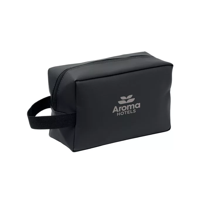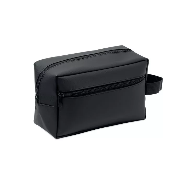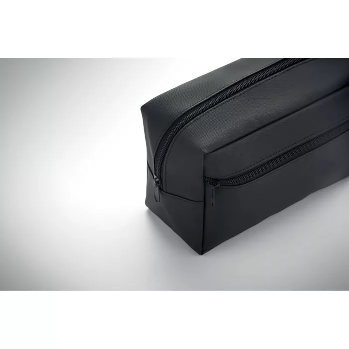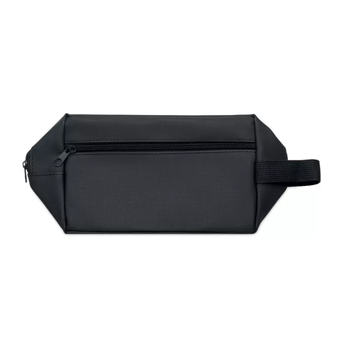 600D RPET poliészterből készült piperetáska PU bevonattal és 210D RPET béléssel. Fogantyúval, cipzáras elülső zsebbel.