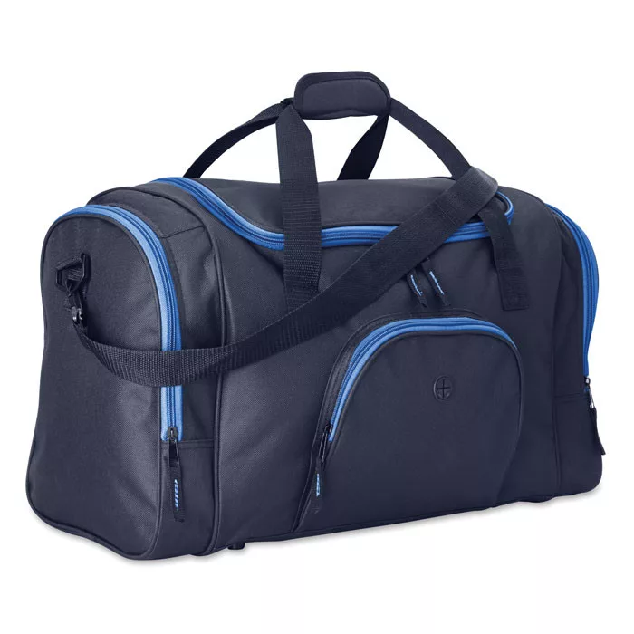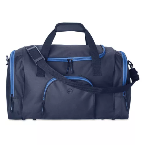Sporttáska 600D poliészter anyagból. 2 cipzáras oldalsó rekesz és egy cipzáras elülső zseb fülhallgató kimeneti nyílással. Állítható és levehető vállpánt.