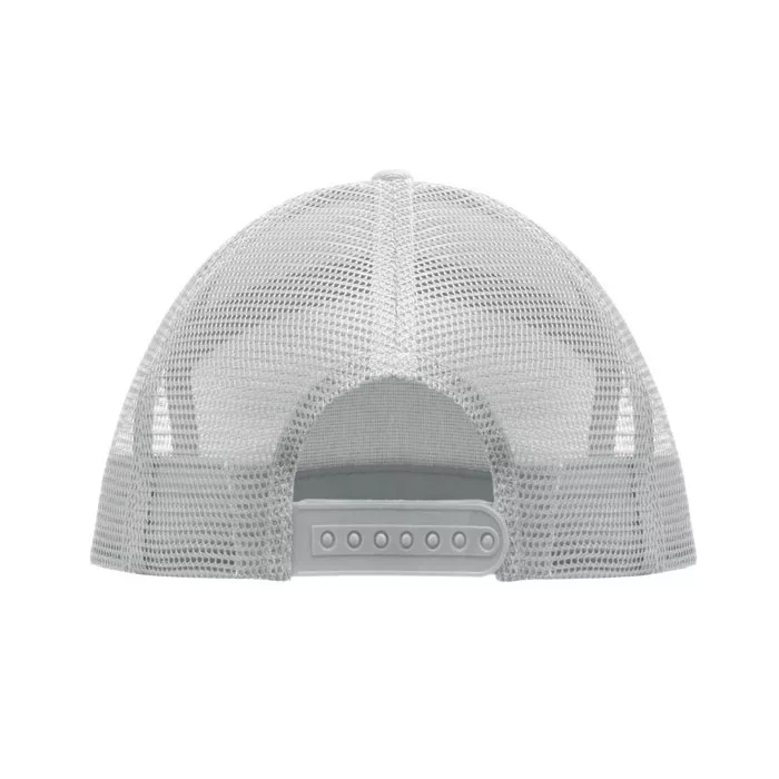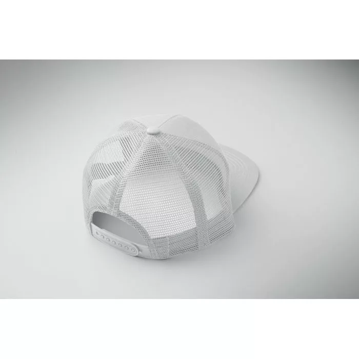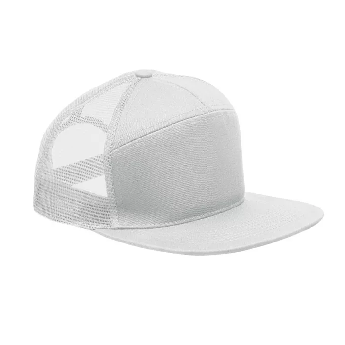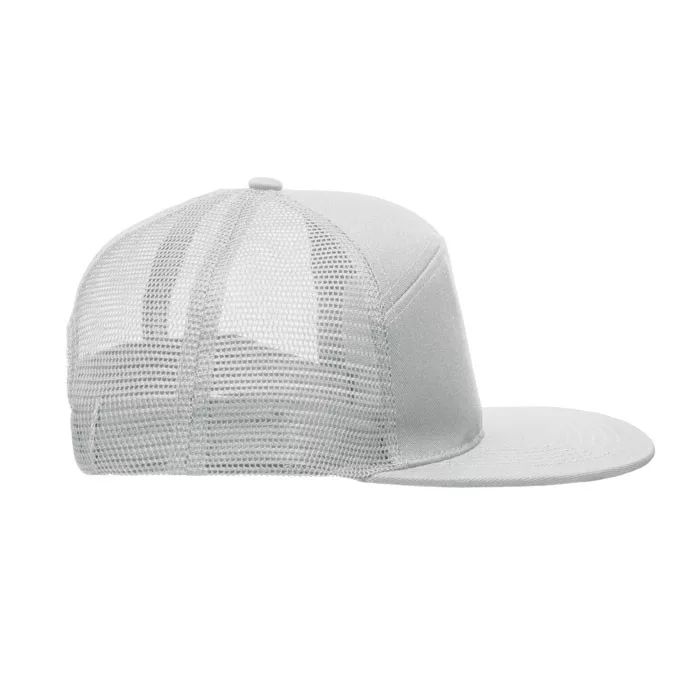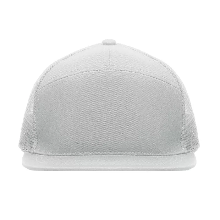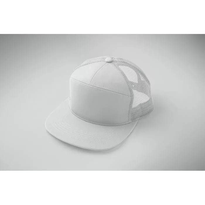 7 paneles, lapos napellenzős sapka pamut twill anyagból, poliészter hálós hátoldallal és műanyag záródással.