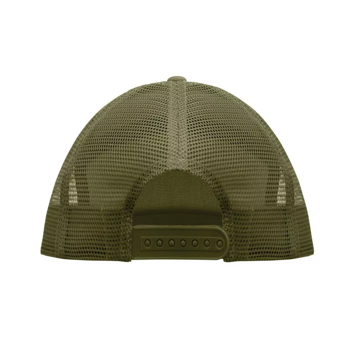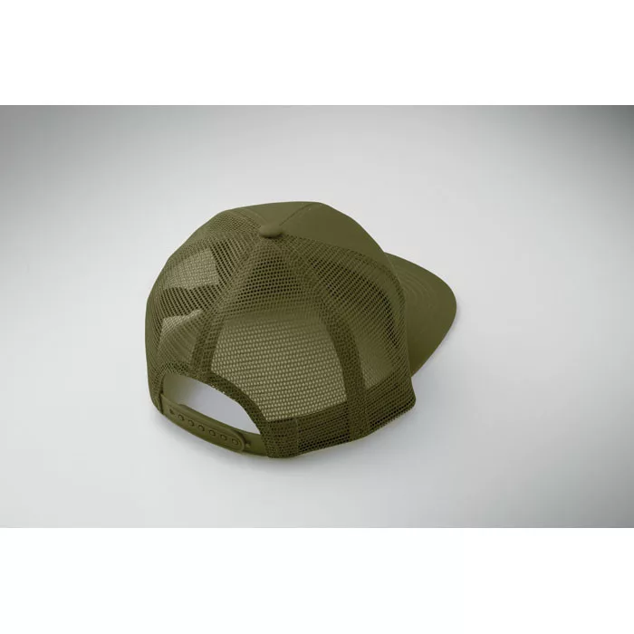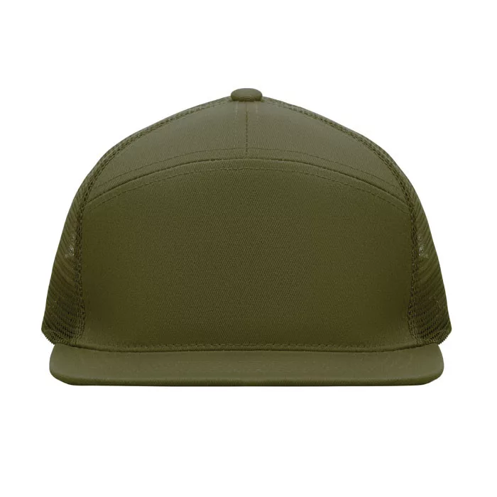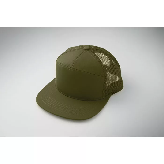 7 paneles, lapos napellenzős sapka pamut twill anyagból, poliészter hálós hátoldallal és műanyag záródással.