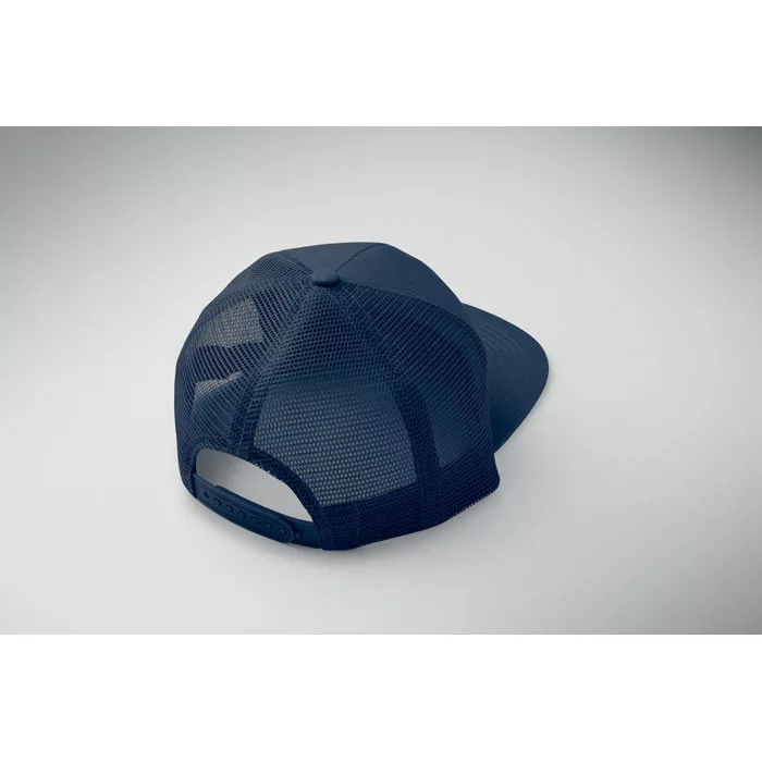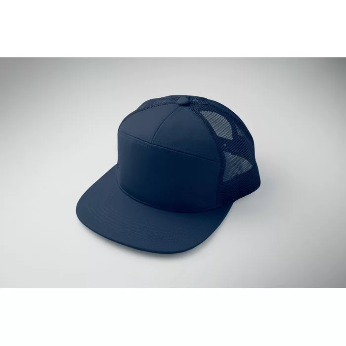 7 paneles, lapos napellenzős sapka pamut twill anyagból, poliészter hálós hátoldallal és műanyag záródással.
