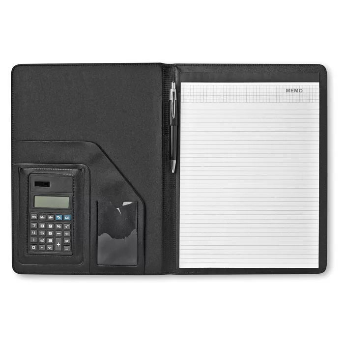 A4 műbőr mappa napelemes számológéppel. 20 oldalas vonalas jegyzettömb. Fém golyóstoll. Kéken író betéttel.