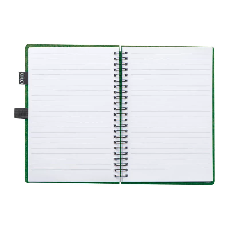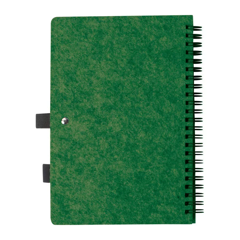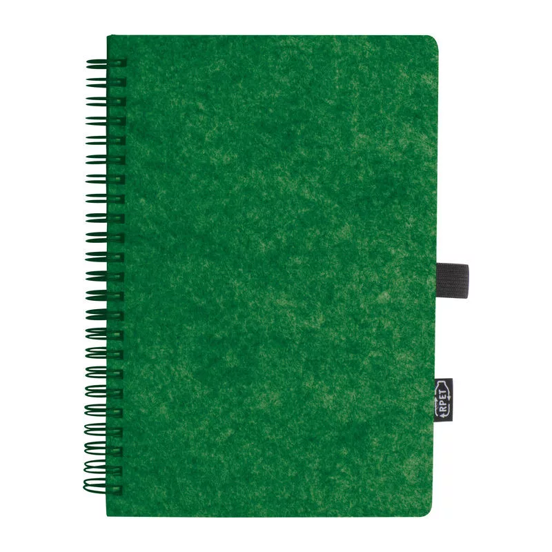 Spirálos, újrahasznosított RPET filc borítós notesz, 160 vonalas, újrahasznosított papírból készült oldallal és tolltartó hurokkal, RPET címkével.