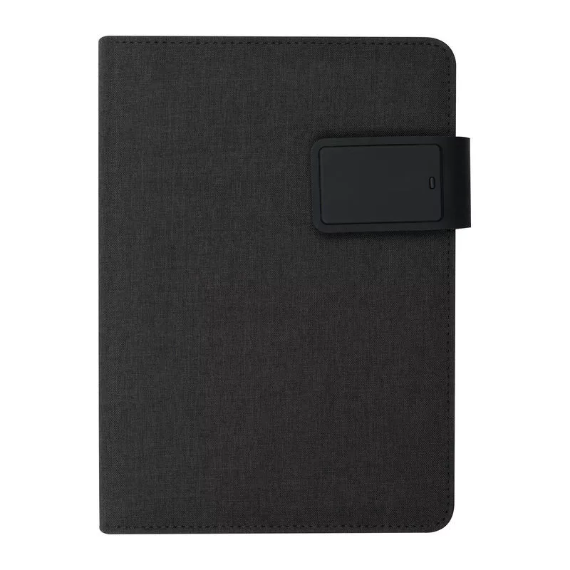 128 oldalas A5 notesz, beépített 4000 mAh-es külső akkumulátorral, tároló zsebekkel, tolltartó pánttal, mobiltartóval és USB töltőkábellel. A termék érdekessége a gumírozott mágneses zár, színes LED-es világítással, így a logó világítani fog!