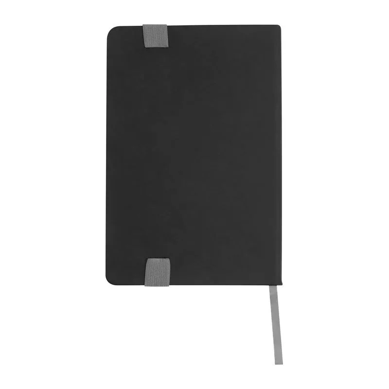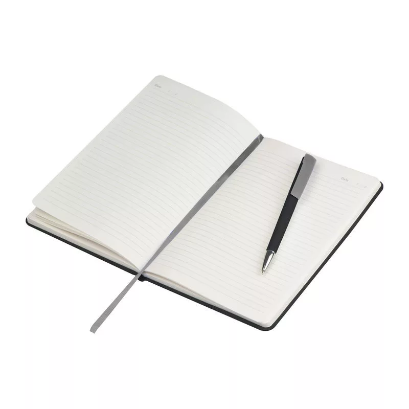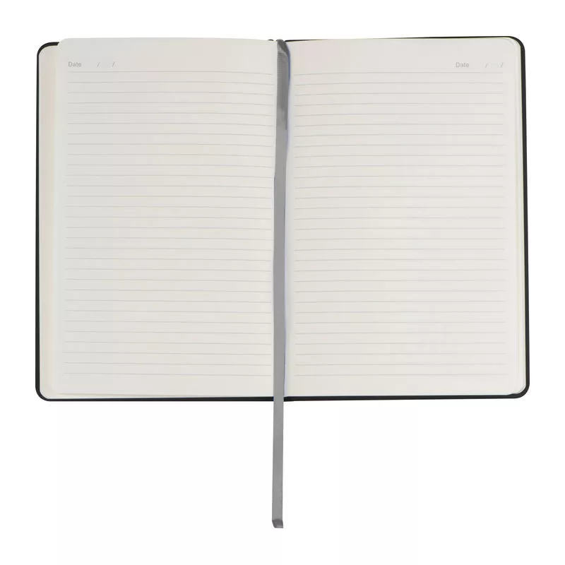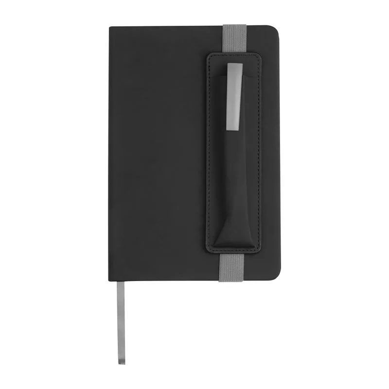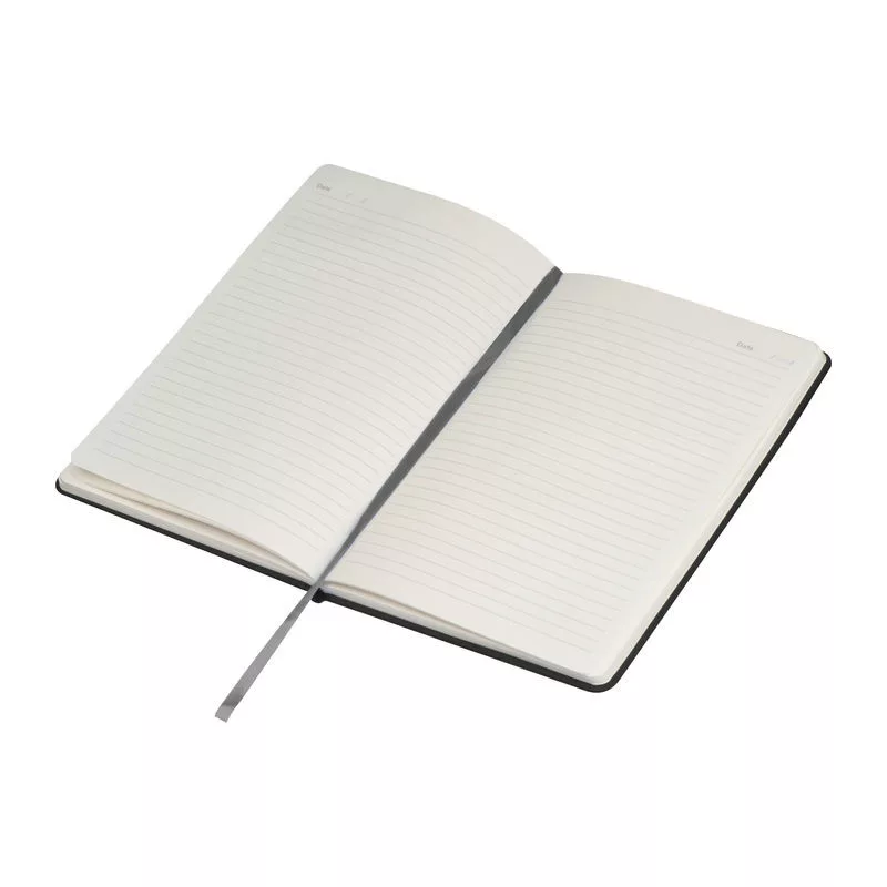 A5 méretű elegáns notesz PU borítással, 192 vonalas oldallal, könyvjelzővel és tolltartóval.