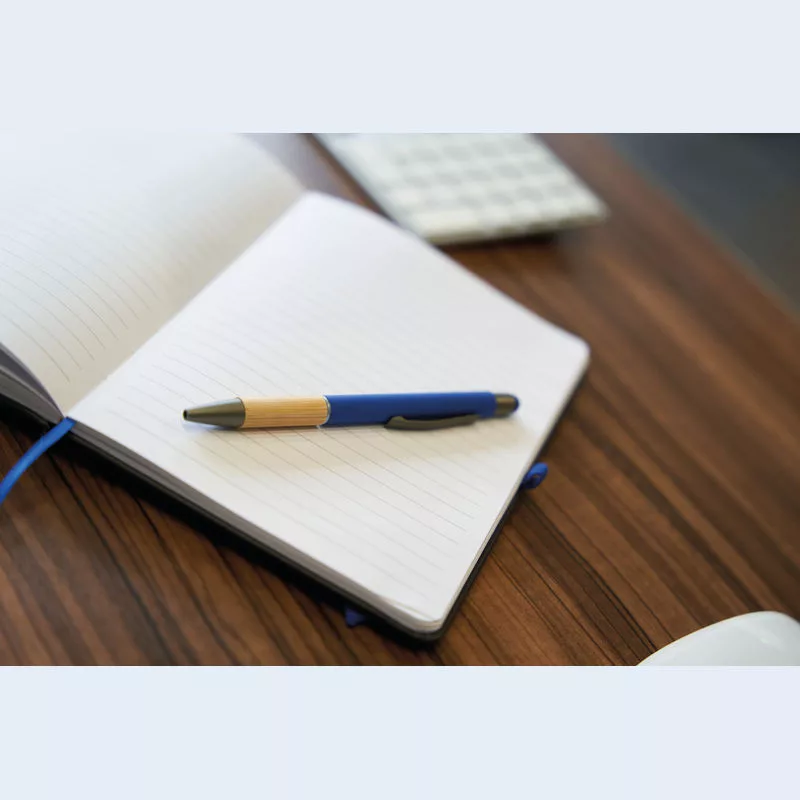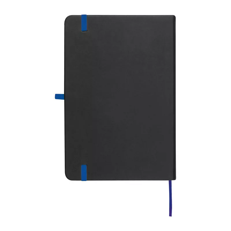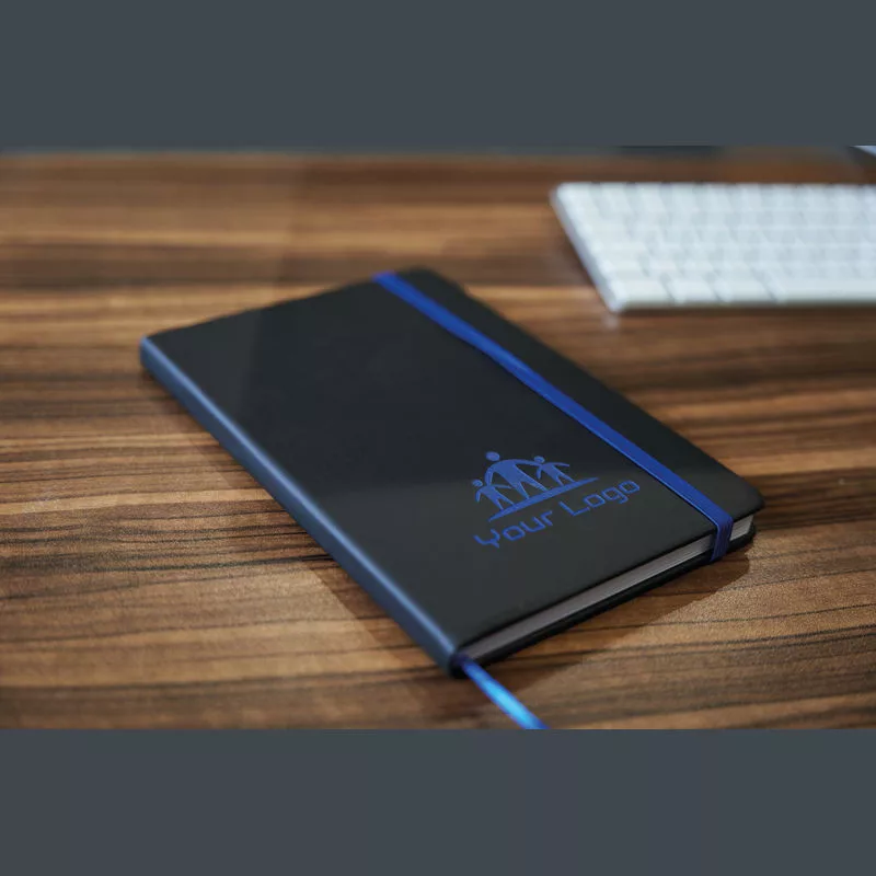 A5 méretű jegyzetfüzet PU borítóval, 192 vonalas oldallal, színes könyvjelzővel, tolltartó hurokkal és gumiszalaggal. A gravírozás színe megegyezik a gumiszalagéval.