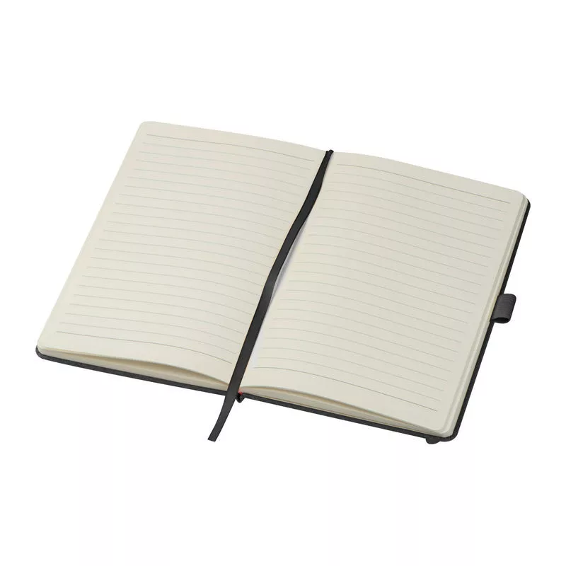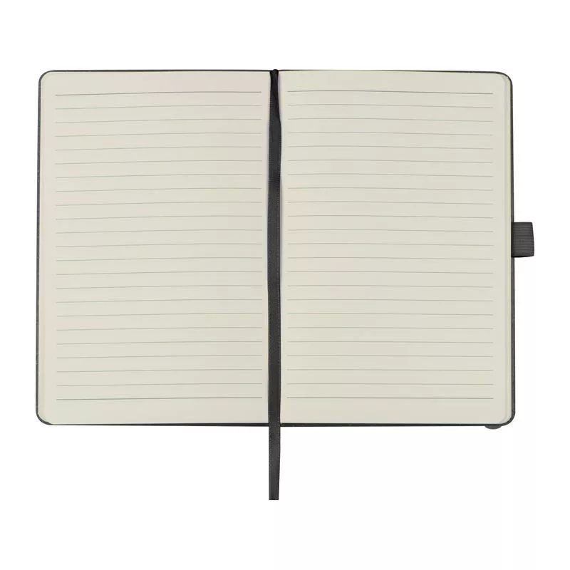 A5-ös notesz újrahasznosított bőrből készült borítóval, gumipánttal, könyvjelzővel, tolltartó hurokkal és 160 vonalas oldallal.
