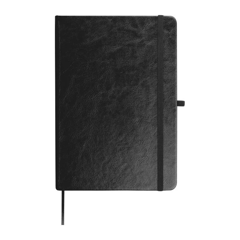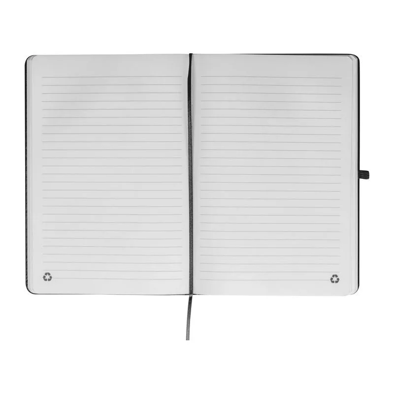 Újrahasznosított A5-ös notesz PU borítással, 192 vonalas oldallal, tolltartó hurokkal és gumipánttal a záráshoz.