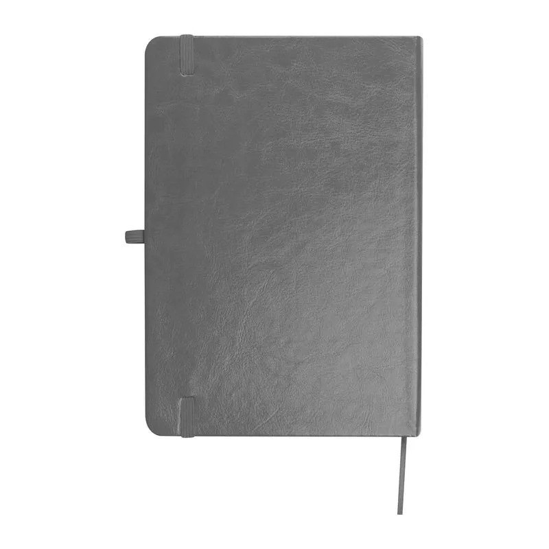 Újrahasznosított A5-ös notesz PU borítással, 192 vonalas oldallal, tolltartó hurokkal és gumipánttal a záráshoz.
