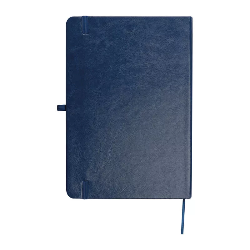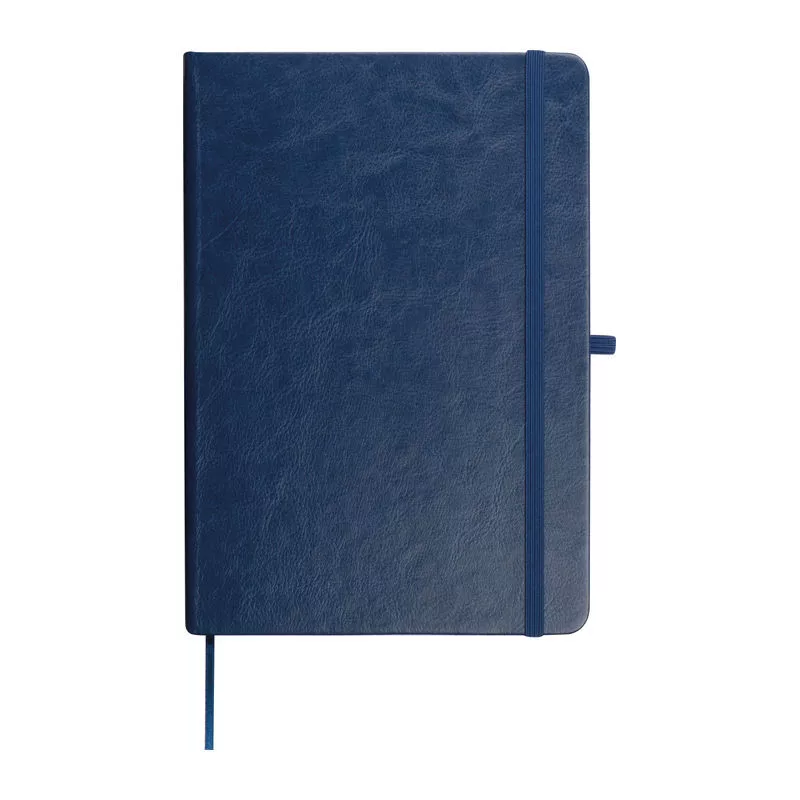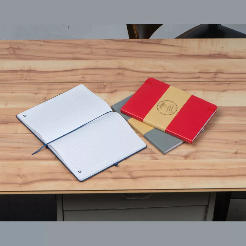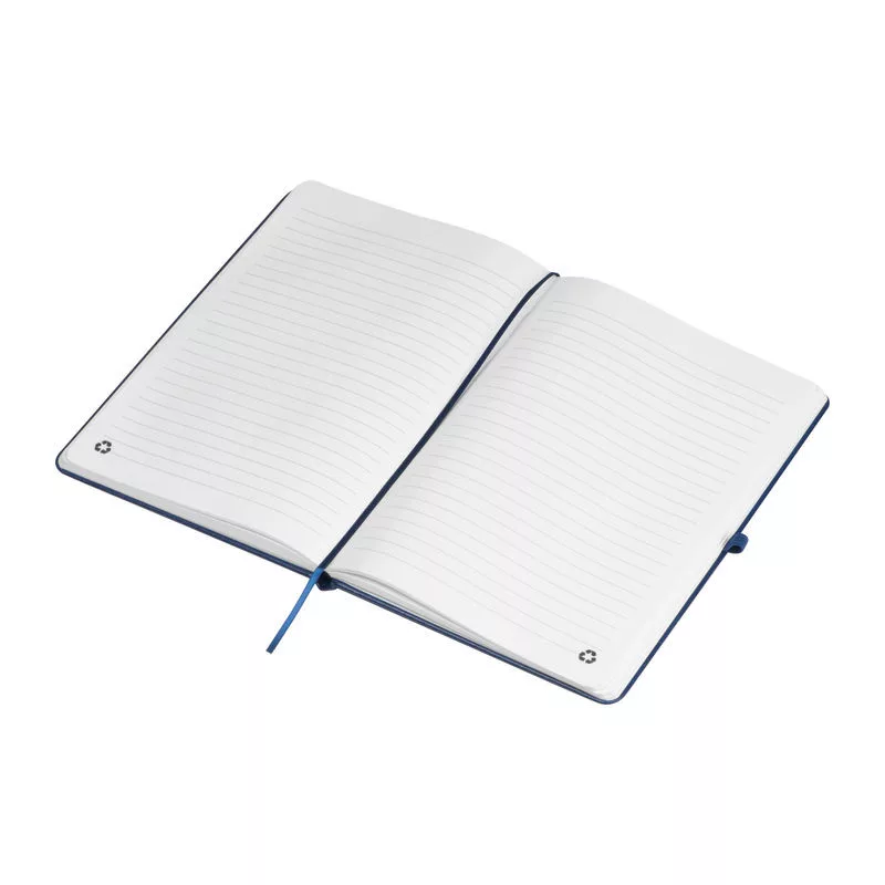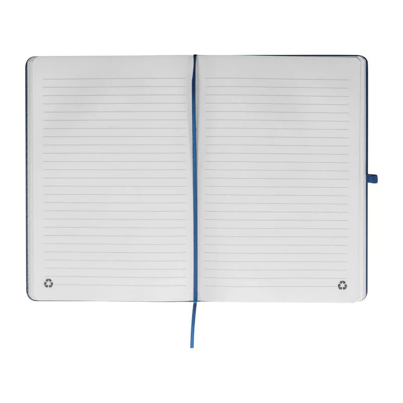 Újrahasznosított A5-ös notesz PU borítással, 192 vonalas oldallal, tolltartó hurokkal és gumipánttal a záráshoz.
