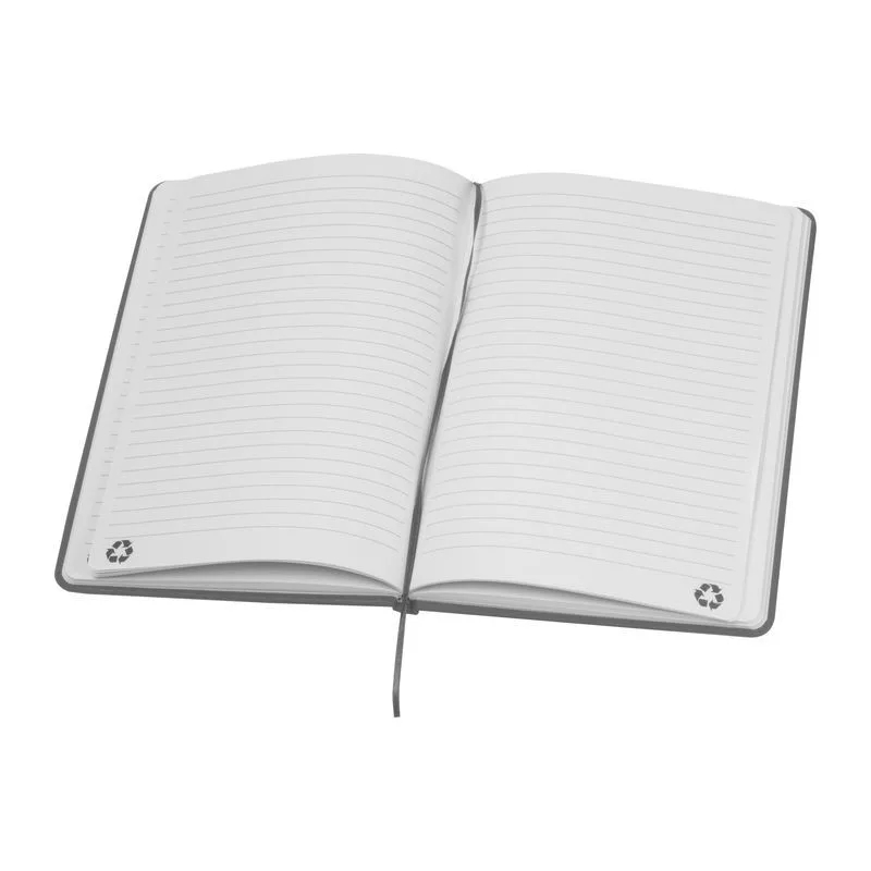 A5 méretű jegyzetfüzet újrahasznosított PU-borítóval és 160 vonalas oldallal, mely újrahasznosított papírból készült.