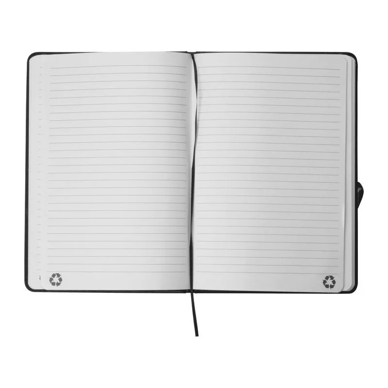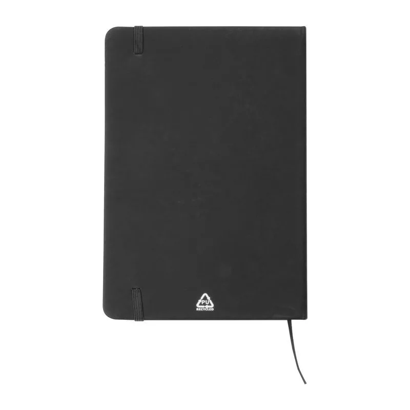 A5 méretű jegyzetfüzet újrahasznosított PU-borítóval és 160 vonalas oldallal, mely újrahasznosított papírból készült.