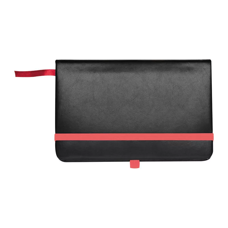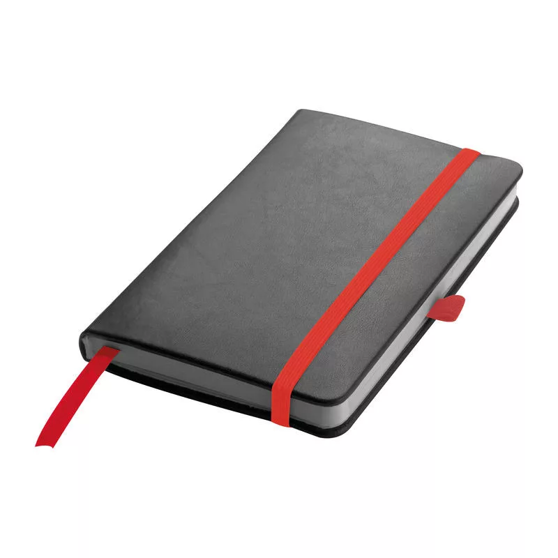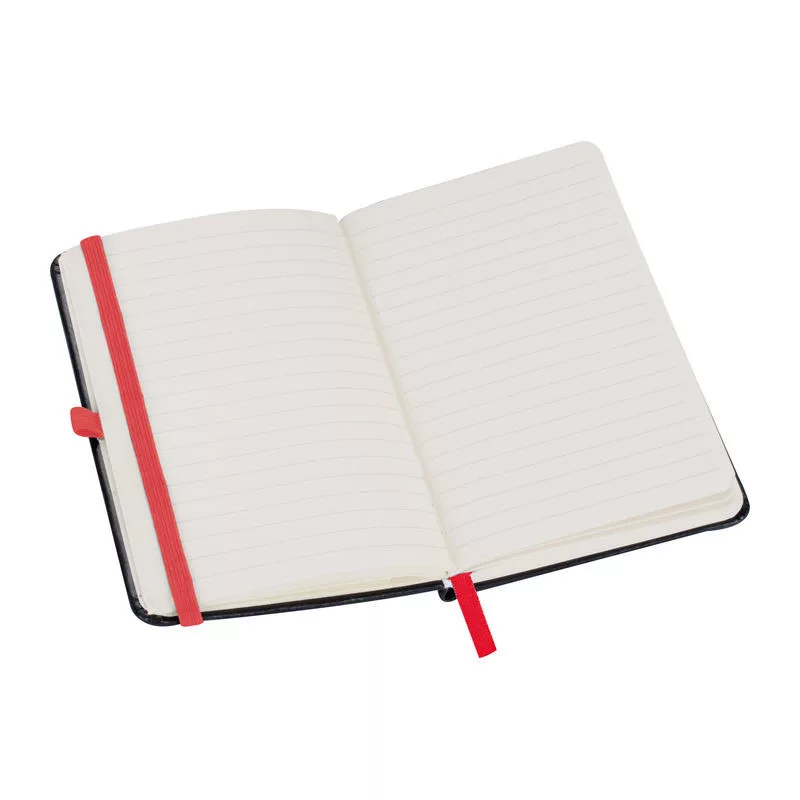 A6 méretű divatos notesz puha műbőr borítással, 160 vonalas oldallal, könyvjelzővel, tolltartó hurokkal, valamint gumi zárópánttal.