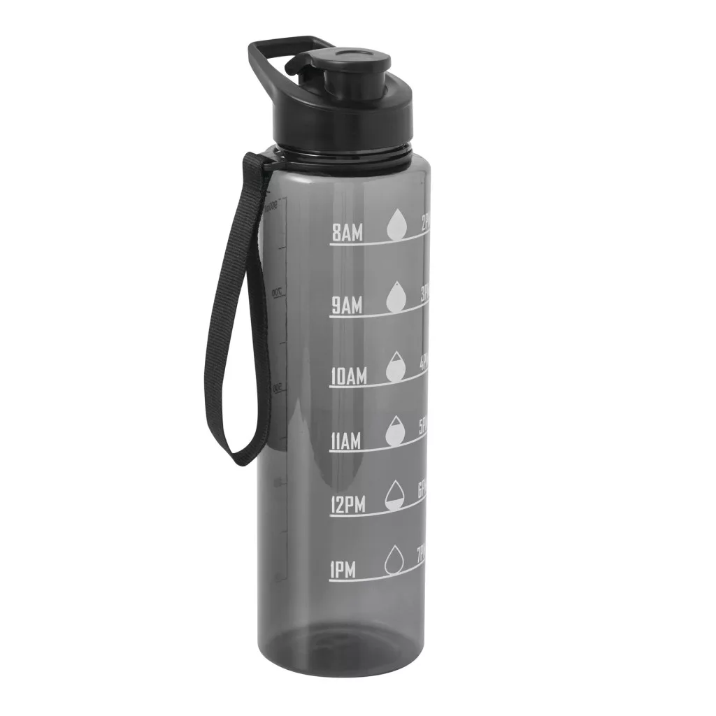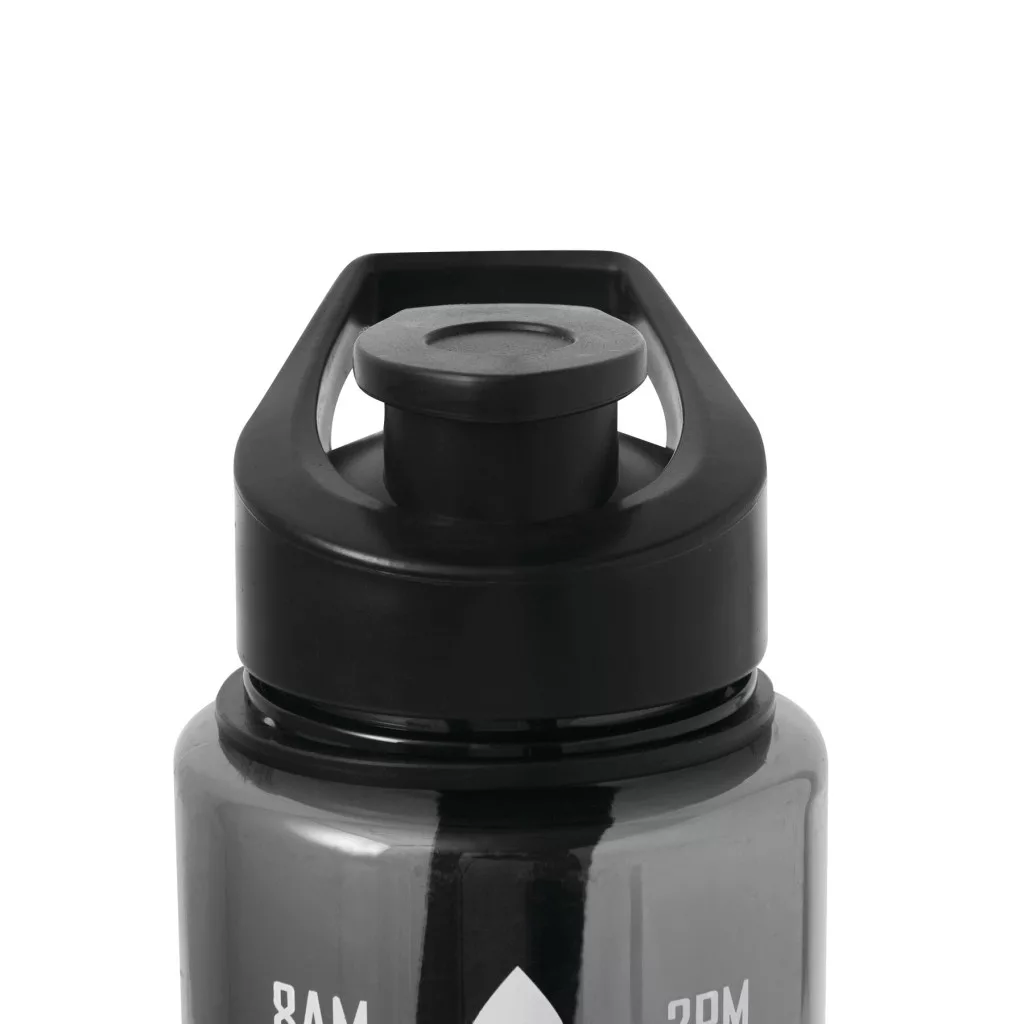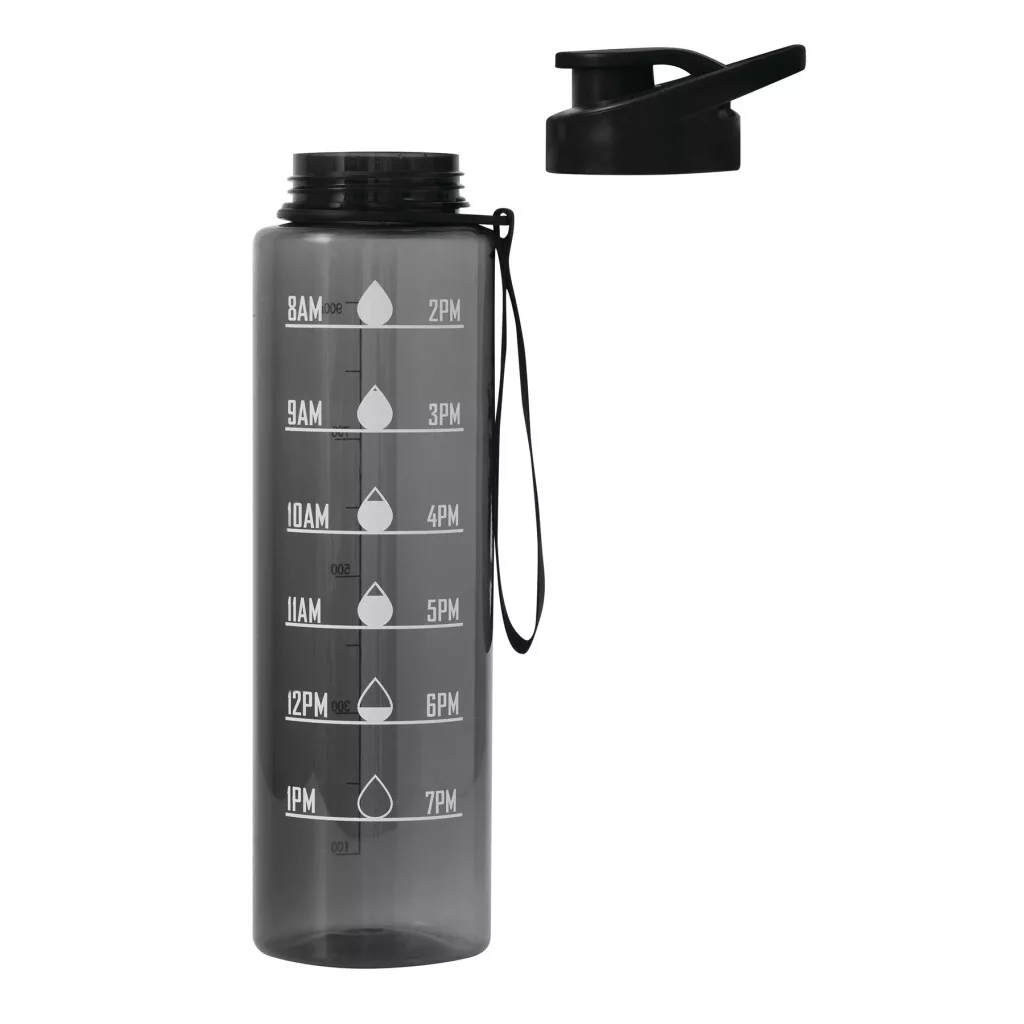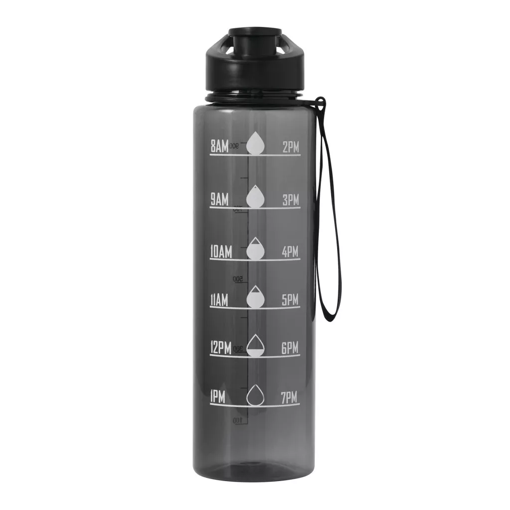 AQUA LEVEL sportkulacs: átlátszó, színes kulacs tartós PETG-ből, színben illeszkedő műanyag csavaros kupakkal, szilikon tömítőgyűrűvel, felhajtható ivócsővel és hordozófogantyúval, motivációs idő- és vízmennyiség-skálával (napszak / ml), csuklópánttal, űrtartalom kb. 1000 ml