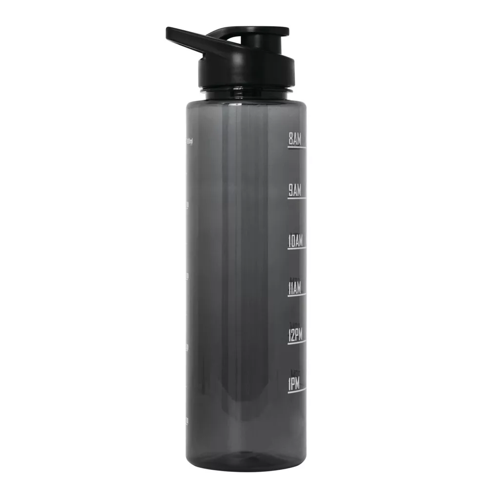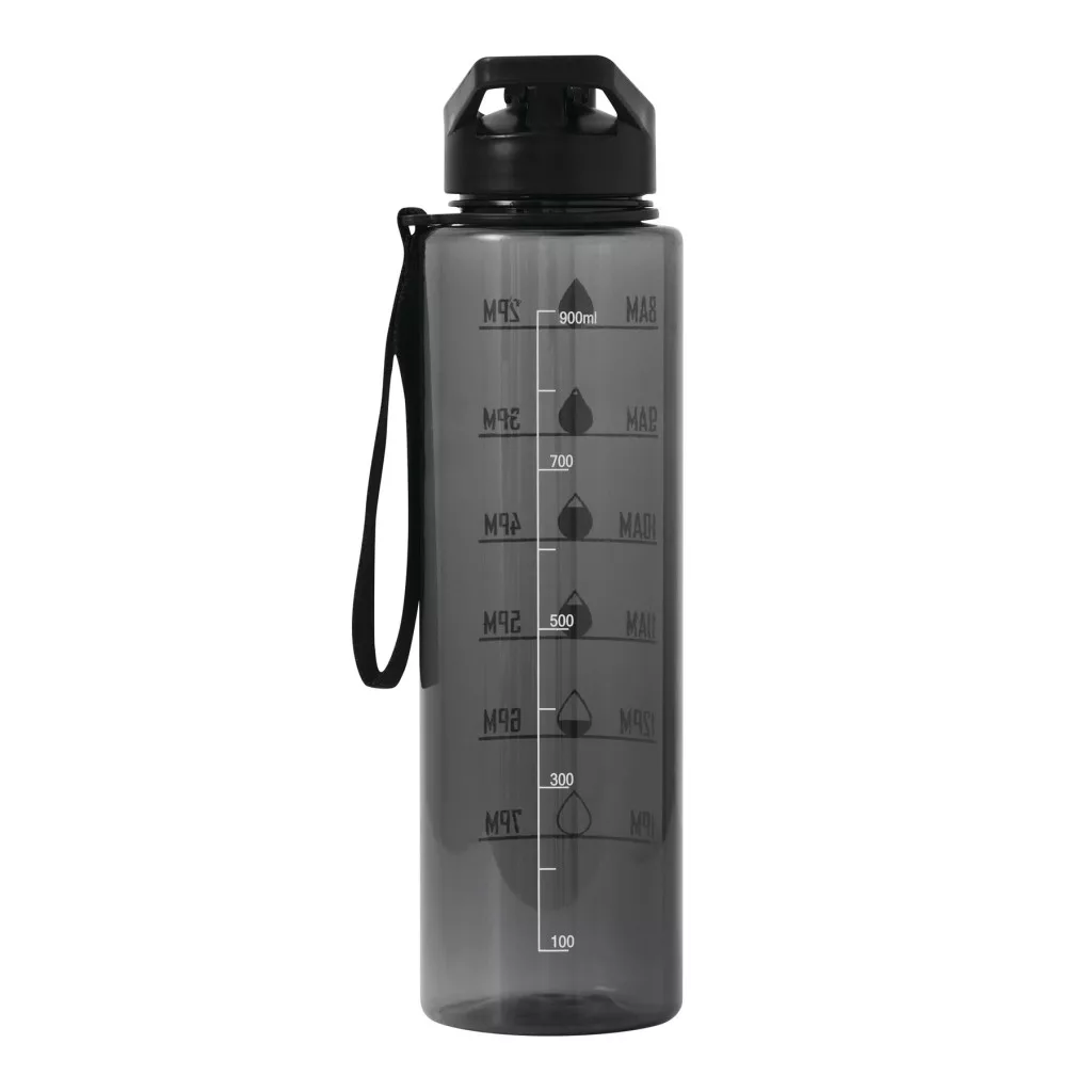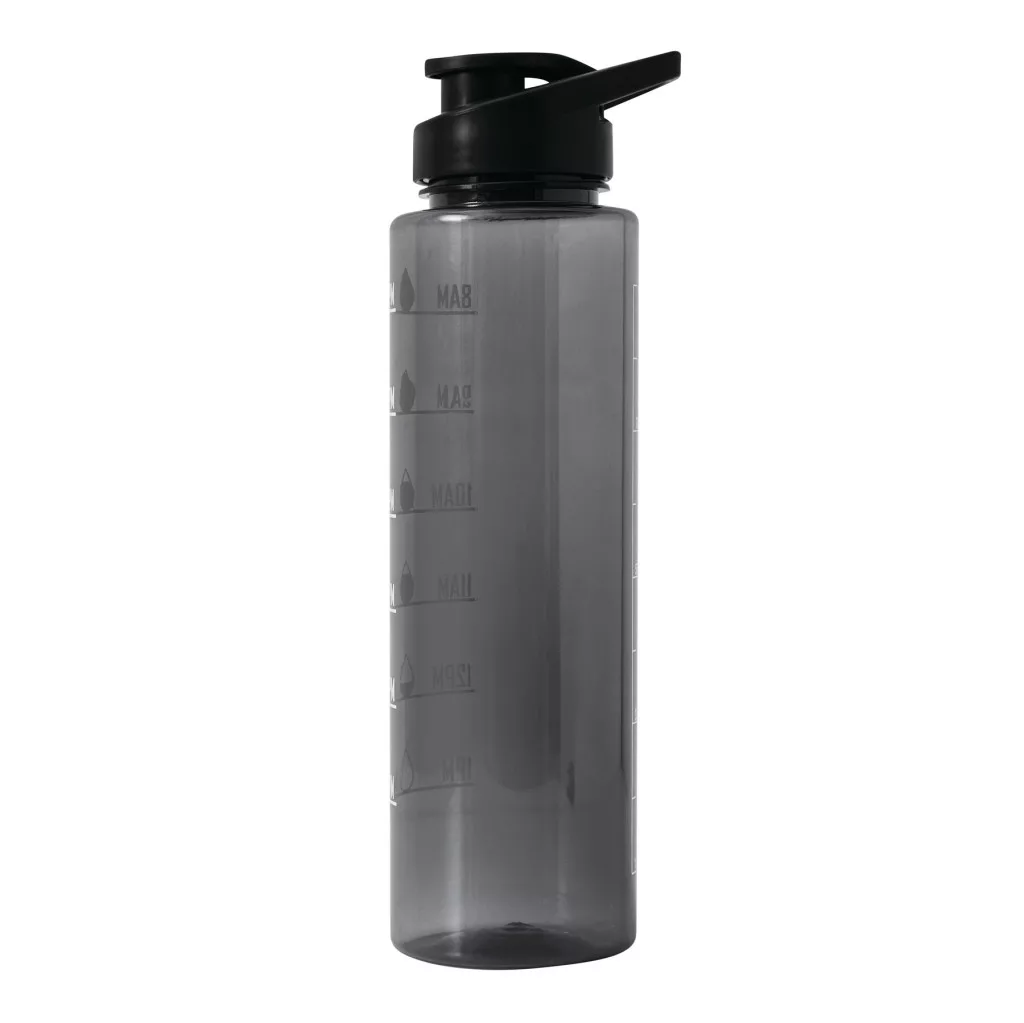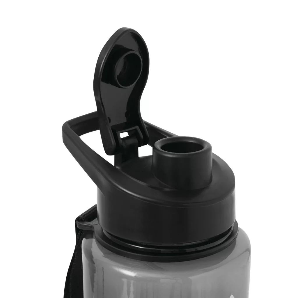 AQUA LEVEL sportkulacs: átlátszó, színes kulacs tartós PETG-ből, színben illeszkedő műanyag csavaros kupakkal, szilikon tömítőgyűrűvel, felhajtható ivócsővel és hordozófogantyúval, motivációs idő- és vízmennyiség-skálával (napszak / ml), csuklópánttal, űrtartalom kb. 1000 ml