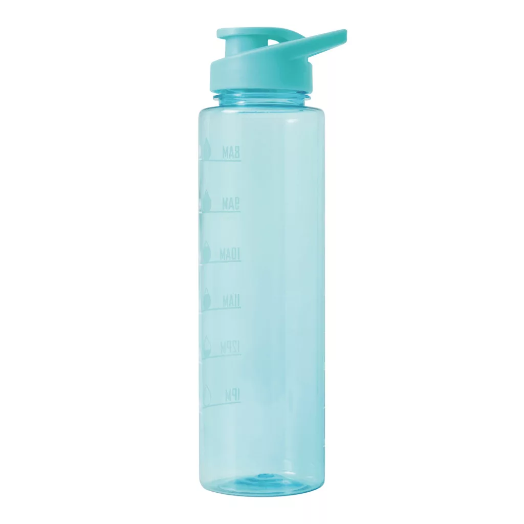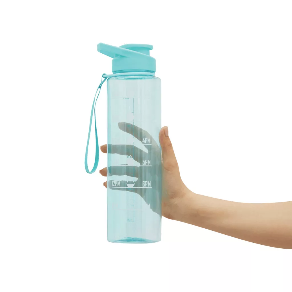AQUA LEVEL sportkulacs: átlátszó, színes kulacs tartós PETG-ből, színben illeszkedő műanyag csavaros kupakkal, szilikon tömítőgyűrűvel, felhajtható ivócsővel és hordozófogantyúval, motivációs idő- és vízmennyiség-skálával (napszak / ml), csuklópánttal, űrtartalom kb. 1000 ml