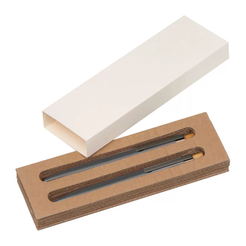 Írószer szett, amely egy kék színű, zselés (Semi-Gel) tollbetéttel ellátott golyóstollat és egy mechanikus töltőceruzát tartalmaz újrahasznosított alumíniumból. Fém klipsz és bambusz nyomógomb tartozik hozzá, környezetbarát dobozban szállítva.