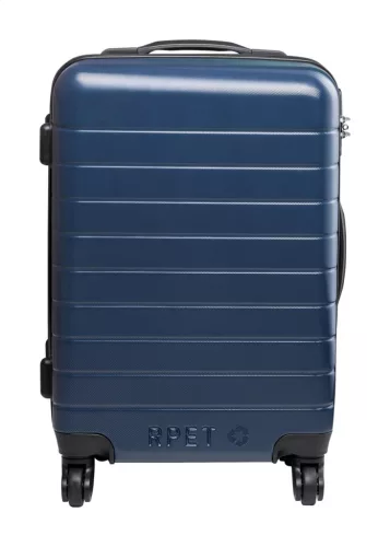RPET gurulós bőrönd 4 dupla kerékkel, teleszkópos fogantyúval és TSA kombinált zárral. RPET belső béléssel és rugalmas rögzítő pántokkal. Megkülönböztető RPET felirattal.