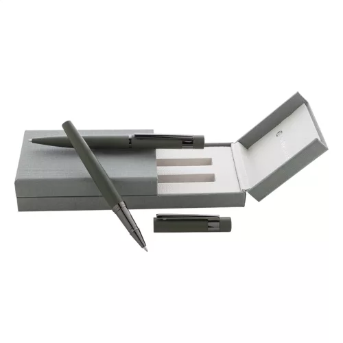 Elegáns, fém golyóstoll és rollertoll szett fényes fegyverfém részletekkel. Színben hozzáillő ajándékdobozban, kék tollbetéttel. André Philippe márkatermék.