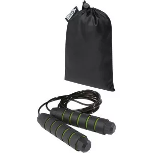 Professzionális ugrálókötél felnőtteknek, ergonomikusan kialakított puha habszivacs fogantyúkkal, mely szilárd és kényelmes fogást biztosít edzés közben. A kötél hossza 310 cm, ami könnyű ugrást tesz lehetővé felnőttek számára 195 cm hosszúságig. A kötél hossza állítható, és beépített, kiváló minőségű, 360 fokban forgatható, nagy sebességű golyóscsapággyal rendelkezik, amely biztosítja a zökkenőmentes, könnyed forgást és elkerüli a gubancolódást. Újrahasznosított PET műanyagból készült tároló tasakkal (21 x 14 cm) szállítjuk, amely remek helyet biztosít a logó nyomtatásához.