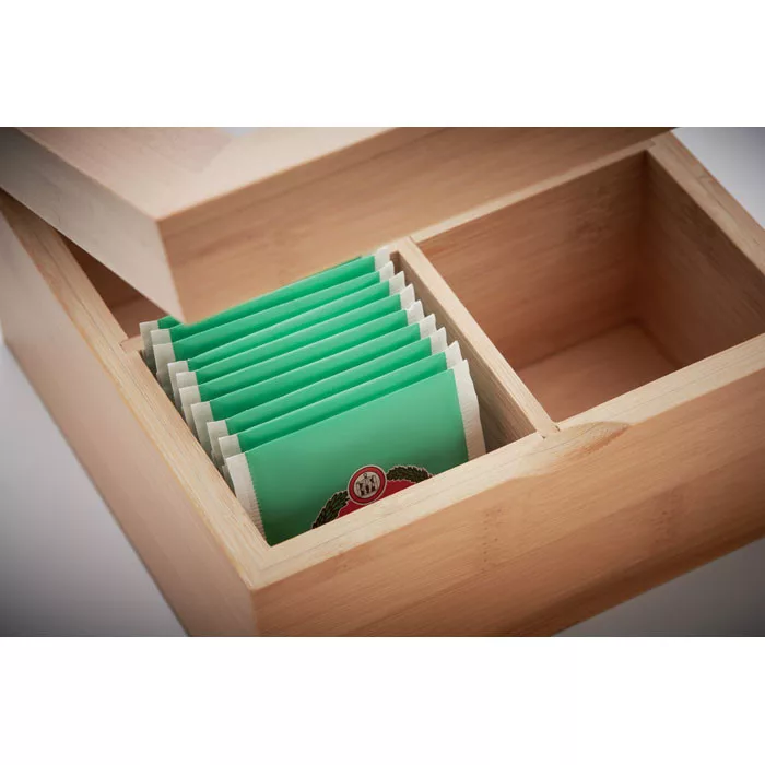 Bambusz teafilter tartó doboz, átlátszó üveg fedéllel. A 4 egyenlően elosztott rekeszben 24 teafiltert könnyen el lehet helyezni. A bambusz természetes anyag, termékenként szín- és méretbeli eltérések jelentkezhetnek, ami befolyásolhatja a dekoráció végső eredményét.