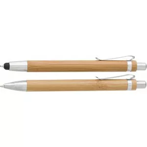 Bambusz tollkészlet kartondobozban. Nyomógombos toll kék tollbetéttel, érintővel és töltőceruza HB keménységű heggyel.