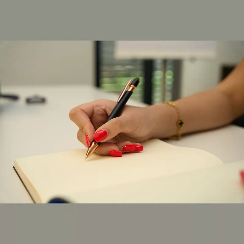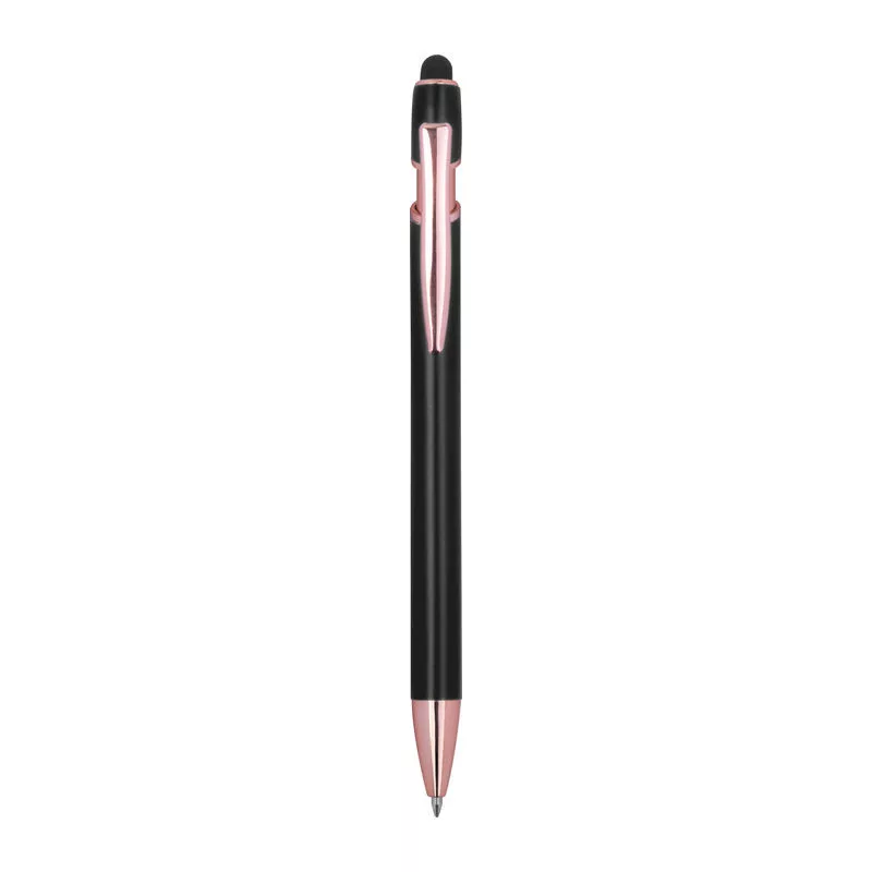 Félig gél tintás (semi-gel) toll újrahasznosított alumíniumból, érintőképernyő-ceruzával és kék tintjú zselével, nagy kapacitású betéttel (1 mm-es hegy).