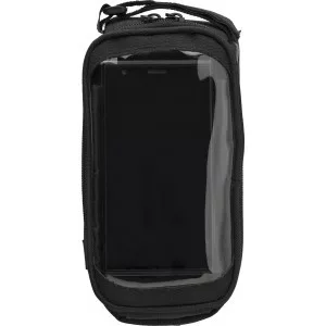Kormányra szerelhető biciklistáska fényvisszaverő csíkokkal, telefontartóval. A PVC telefontartó zseb nem akadályozza az érintőképernyős telefonok kezelését sem. A táska egyik oldalán nyílás található a fülhallgató kivezetéséhez. A kormányra tépőzárral rögzíthető. 600D poliészter és PVC.
