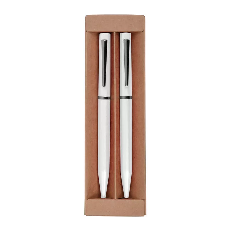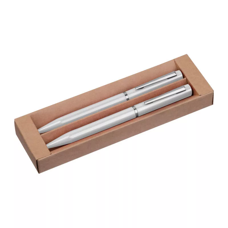 Írószett, amely egy kék tintával író golyóstollból, egy tintamentes ceruzából és egy papírdobozból áll. Mindkét írószer újrahasznosított ABS műanyagból készült.