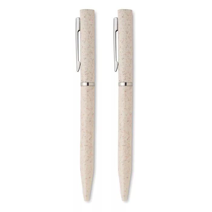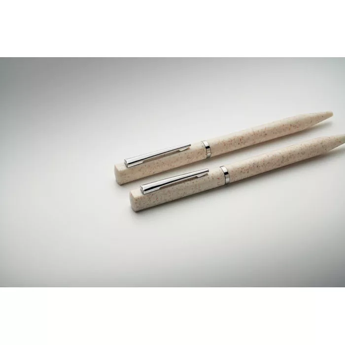 Búzaszalma/ABS tollkészlet csavarzáras, kéken író golyóstollal és csavarzáras, grafit, tintamentes golyóstollal. Újrahasznosított papírdobozban. FSC®-certified | FSC MIX, P5.1, FSC-C213206