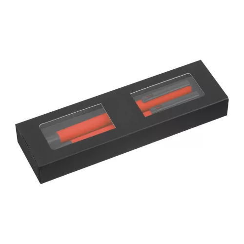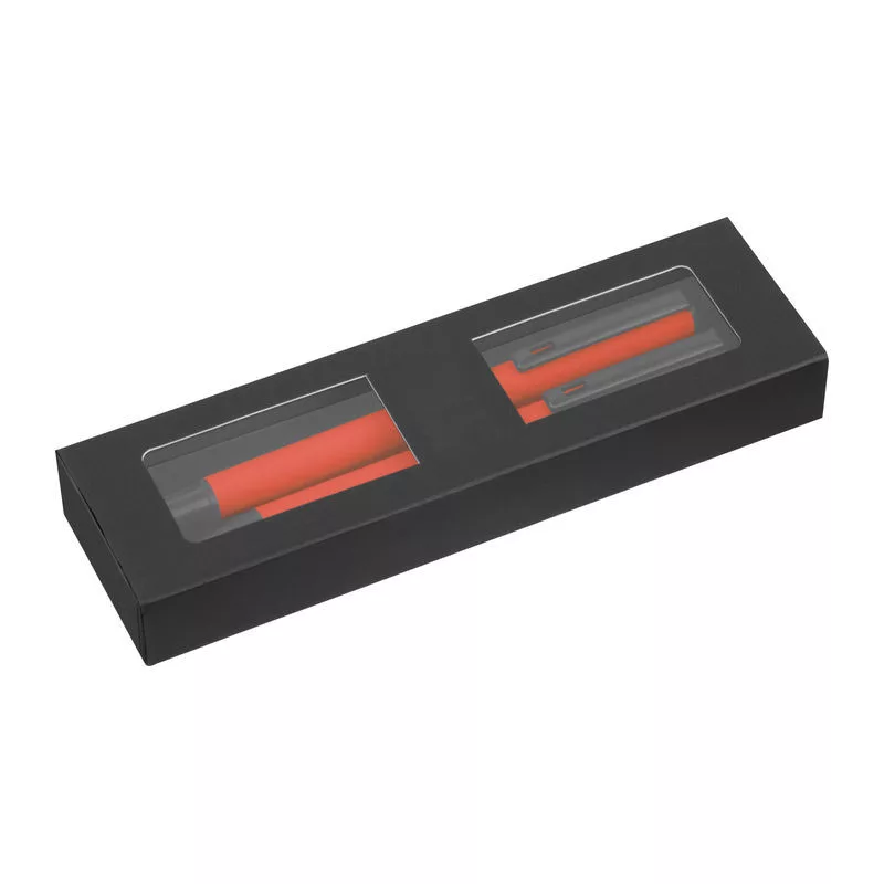 Gumírozott írókészlet fekete tintás roller tollal és kék tintás csavaros mechanizmusú golyóstollal, mindkettő nagy kapacitású műanyag töltőbetéttel felszerelve, elegáns díszdobozban.