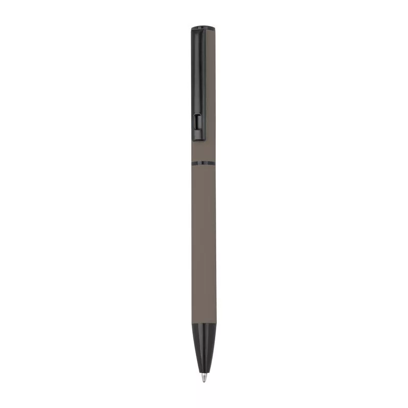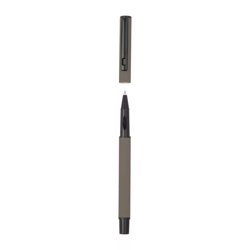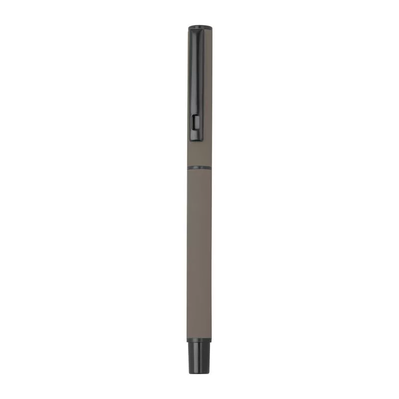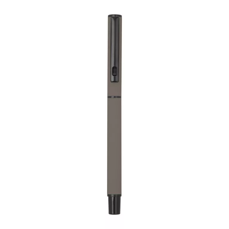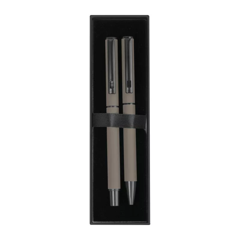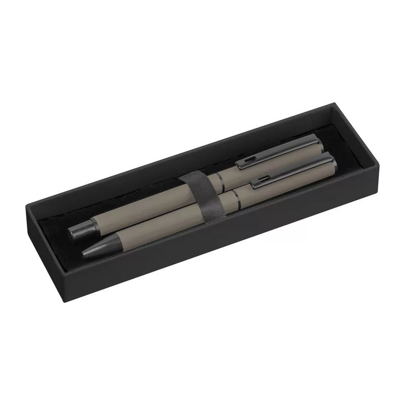 Gumírozott írókészlet fekete tintás roller tollal és kék tintás csavaros mechanizmusú golyóstollal, mindkettő nagy kapacitású műanyag töltőbetéttel felszerelve, elegáns díszdobozban.
