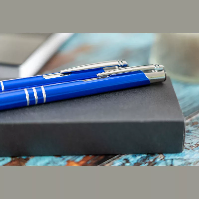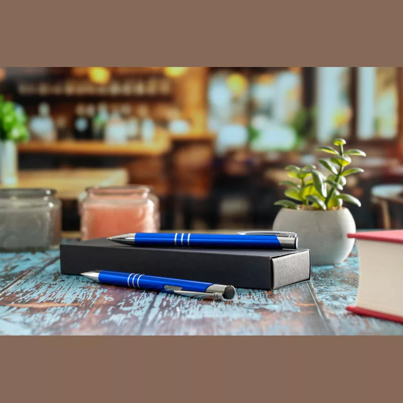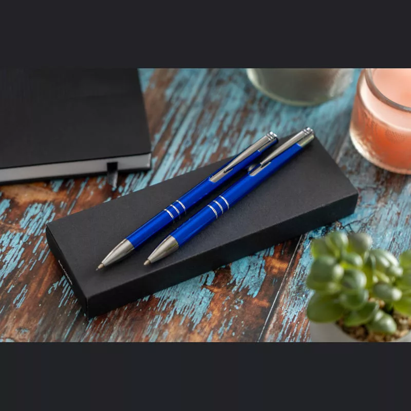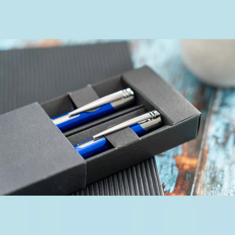 Fém írókészlet, amely egy nagy kapacitású kék tintapatronos golyóstollat és egy mechanikus ceruzát tartalmaz, elegáns kartondobozba csomagolva.