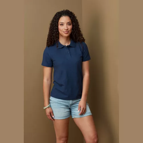 Puha single jersey női pólóing, vonzó piqué hatással, bordázott gallérral és két színben harmonizáló gombbal, mandzsetta nélküli ujjak, nyakszalag, oldalsó varrások, méret- és ápolási címke a gallérban. Anyaga 100% gyűrűsfonású pamut; piqué kinézet (GYH: 85% pamut, 15% viszkóz).