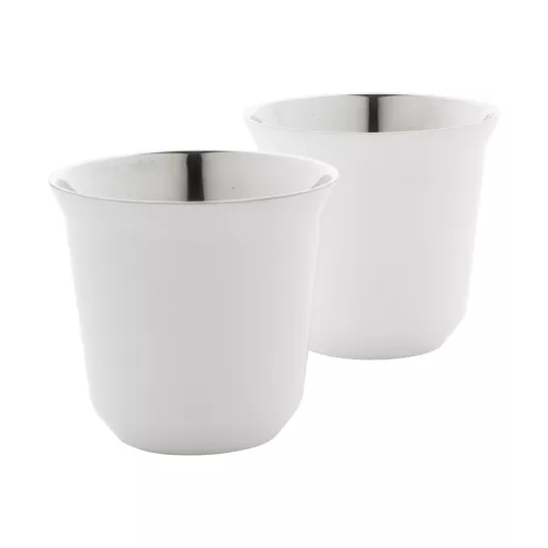 2 darabos eszpresszó csésze szett kávékapszula alakú, duplafalú, hőszigetelt thermo csészékkel, újrahasznosított rozsdamentes acélból, 80 ml. Kraft papír dobozban.