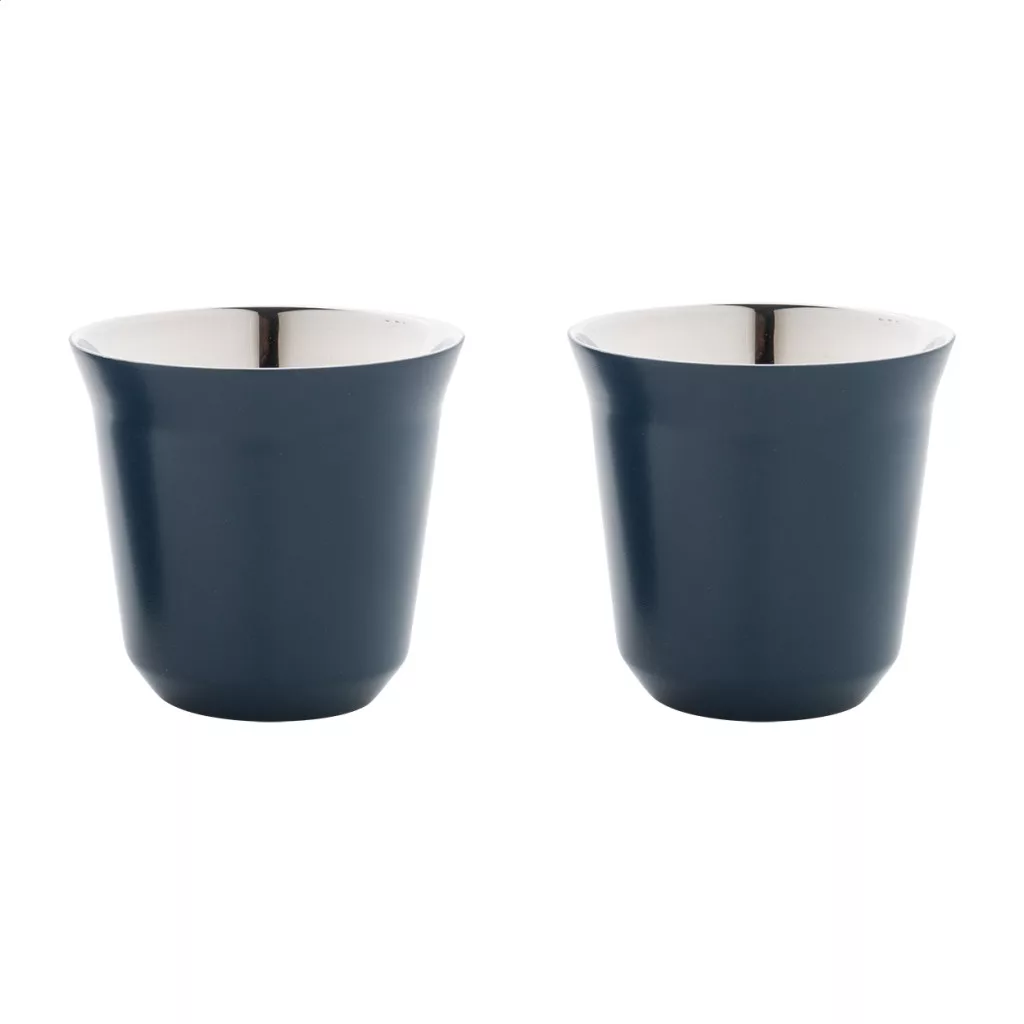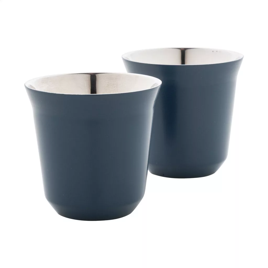 2 darabos eszpresszó csésze szett kávékapszula alakú, duplafalú, hőszigetelt thermo csészékkel, újrahasznosított rozsdamentes acélból, 80 ml. Kraft papír dobozban.