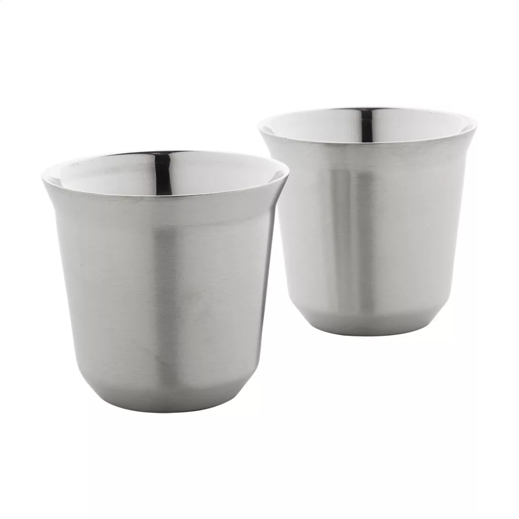 2 darabos eszpresszó csésze szett kávékapszula alakú, duplafalú, hőszigetelt thermo csészékkel, újrahasznosított rozsdamentes acélból, 80 ml. Kraft papír dobozban.