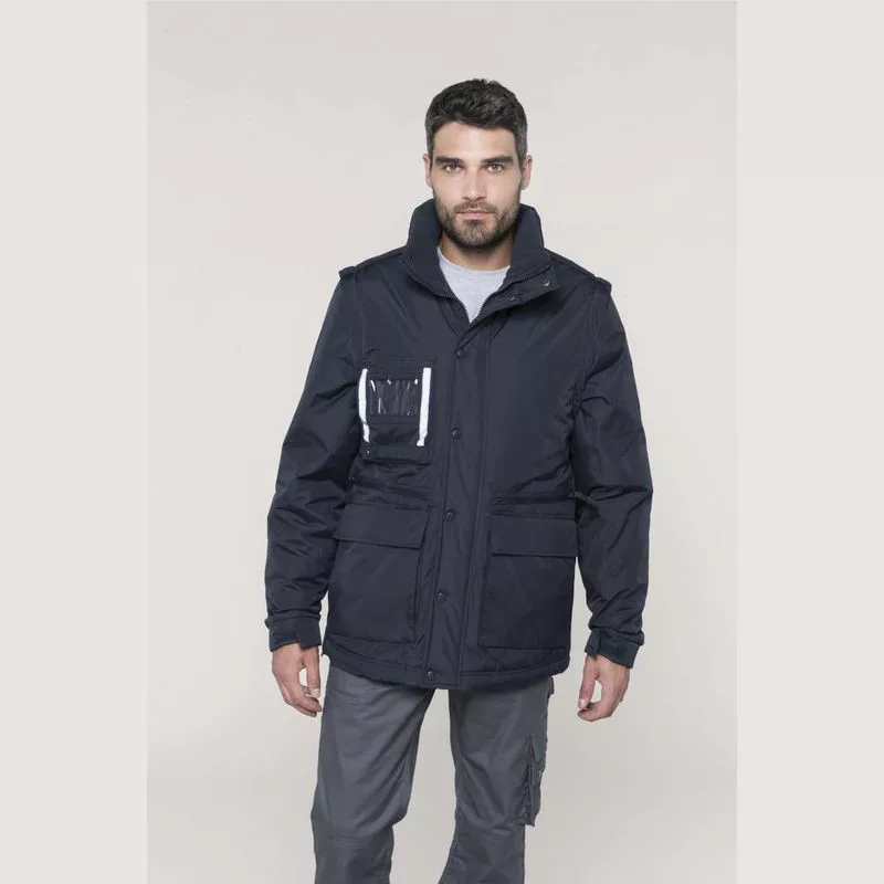 PVC coated 100% polyester ripstop outer;Fully padded;Fleece lined back and inner collar;Full front zip with studded flap;Detachable sleeves;5 functional front pockets including 1 for badge holder;1 inner pocket;Reflective trims on chest and back;Reinforced shoulder panels;Side zip opening for ease of movement;Ajdustable drawcord at waist;Concealed hood;Zip access for decoration at chest and hem;